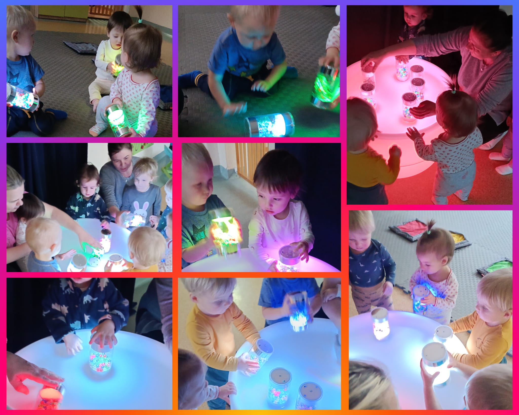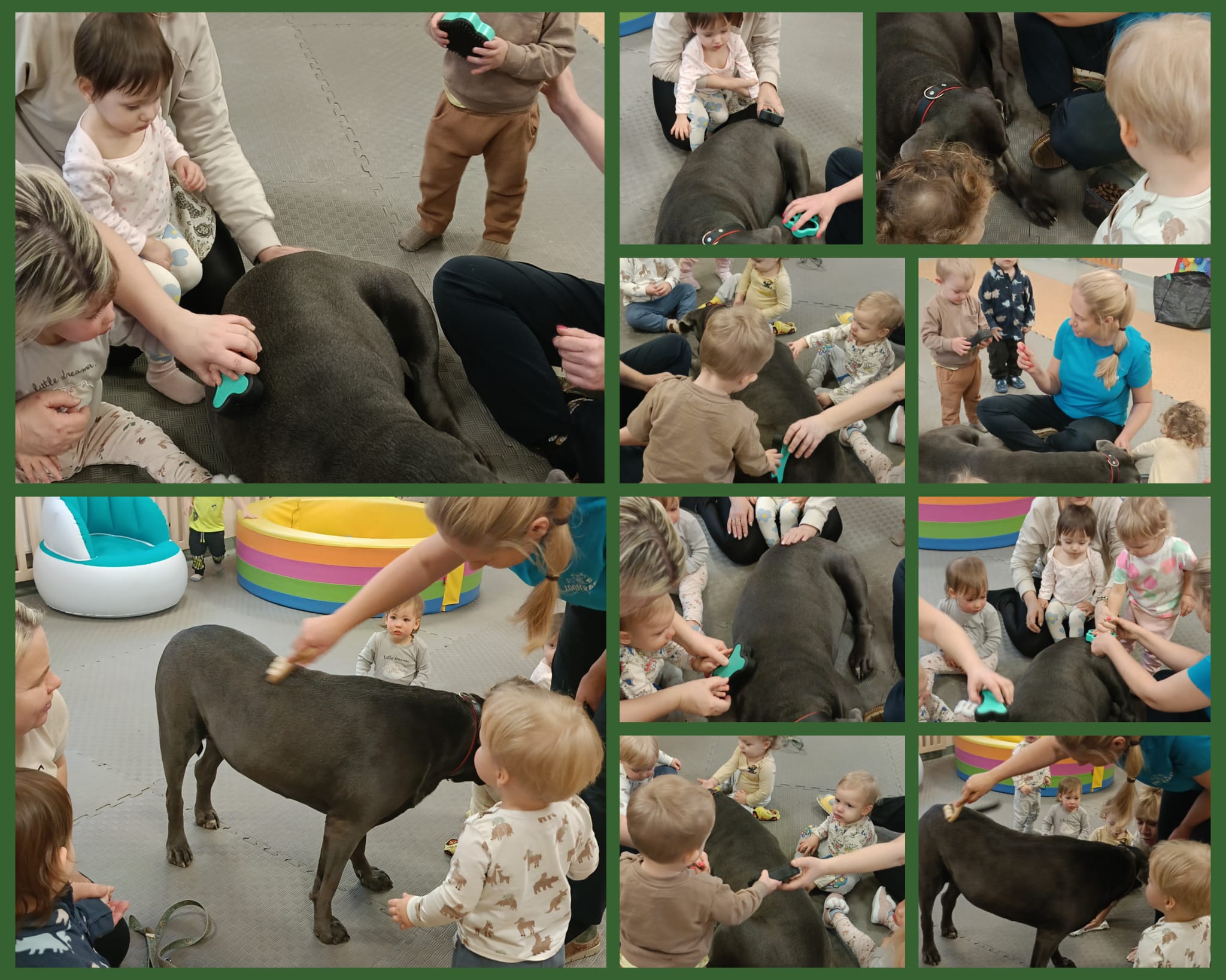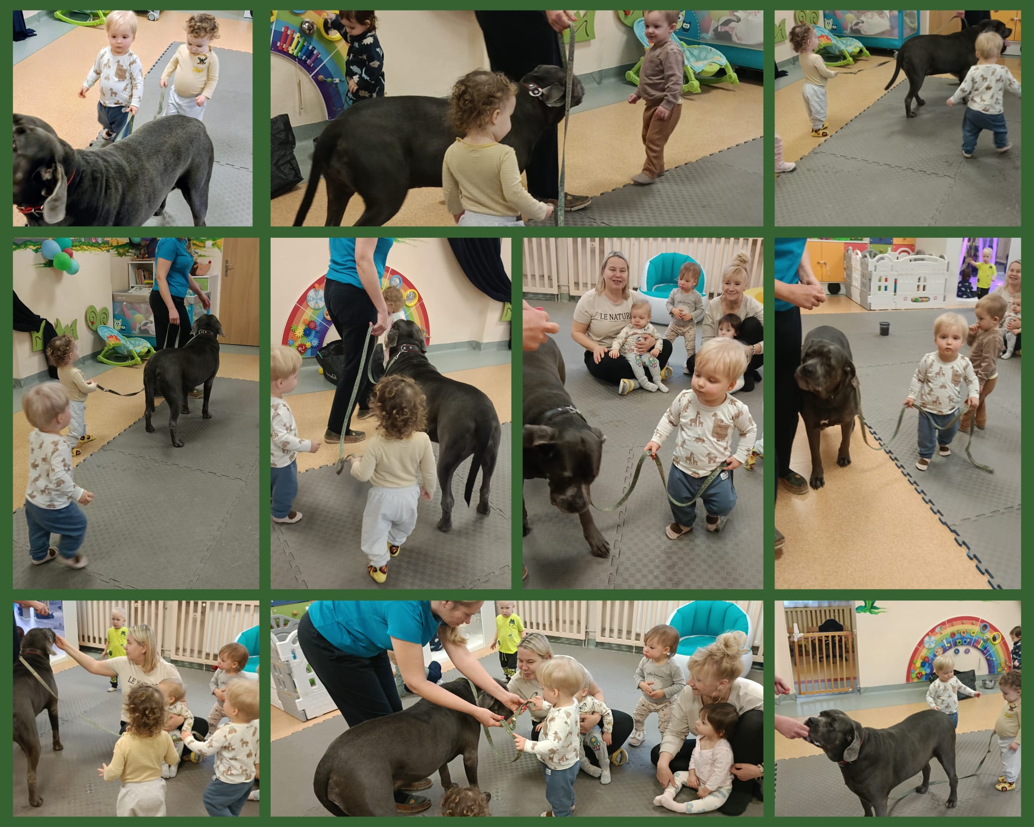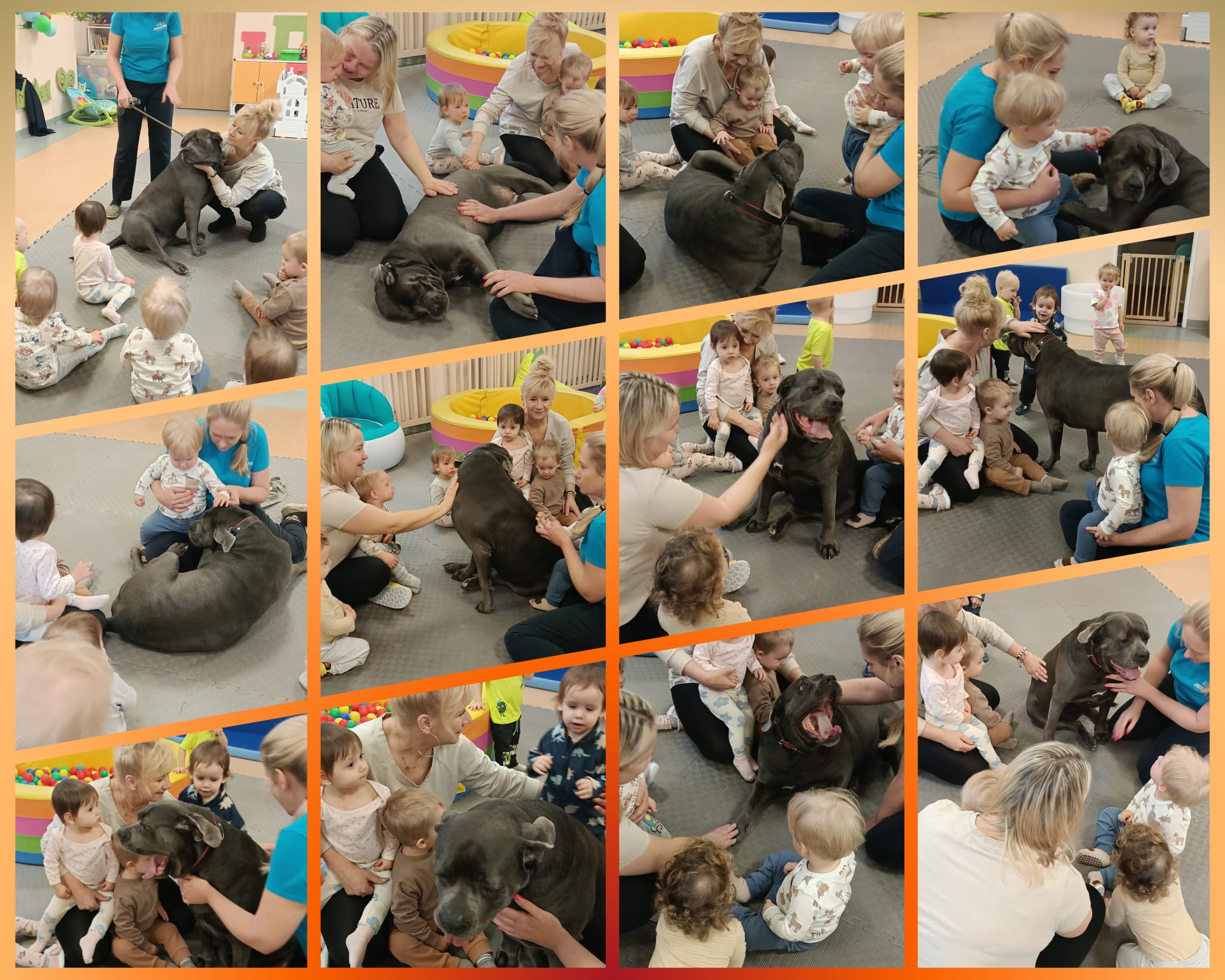 W minionym czasie maluszki brały również udział w zajęciach ruchowych i sensorycznych z wykorzystaniem świetlnych tub. Zabawy ze światłem i dżwiękiem pozwoliły dzieciom wyciszyć się i skupić na konkretnych bodźcach. Dużą niespodzianką okazała się dogoterapia.Odwiedził nas pies o imieniu Aira. Zajecia z czworonożnym pupilem pomagały dzieciom w przełamywaniu lękow, uczyły empatii i stymulowały zmysły.