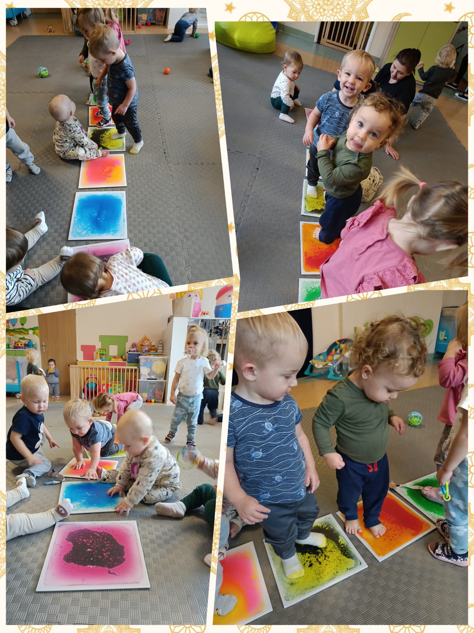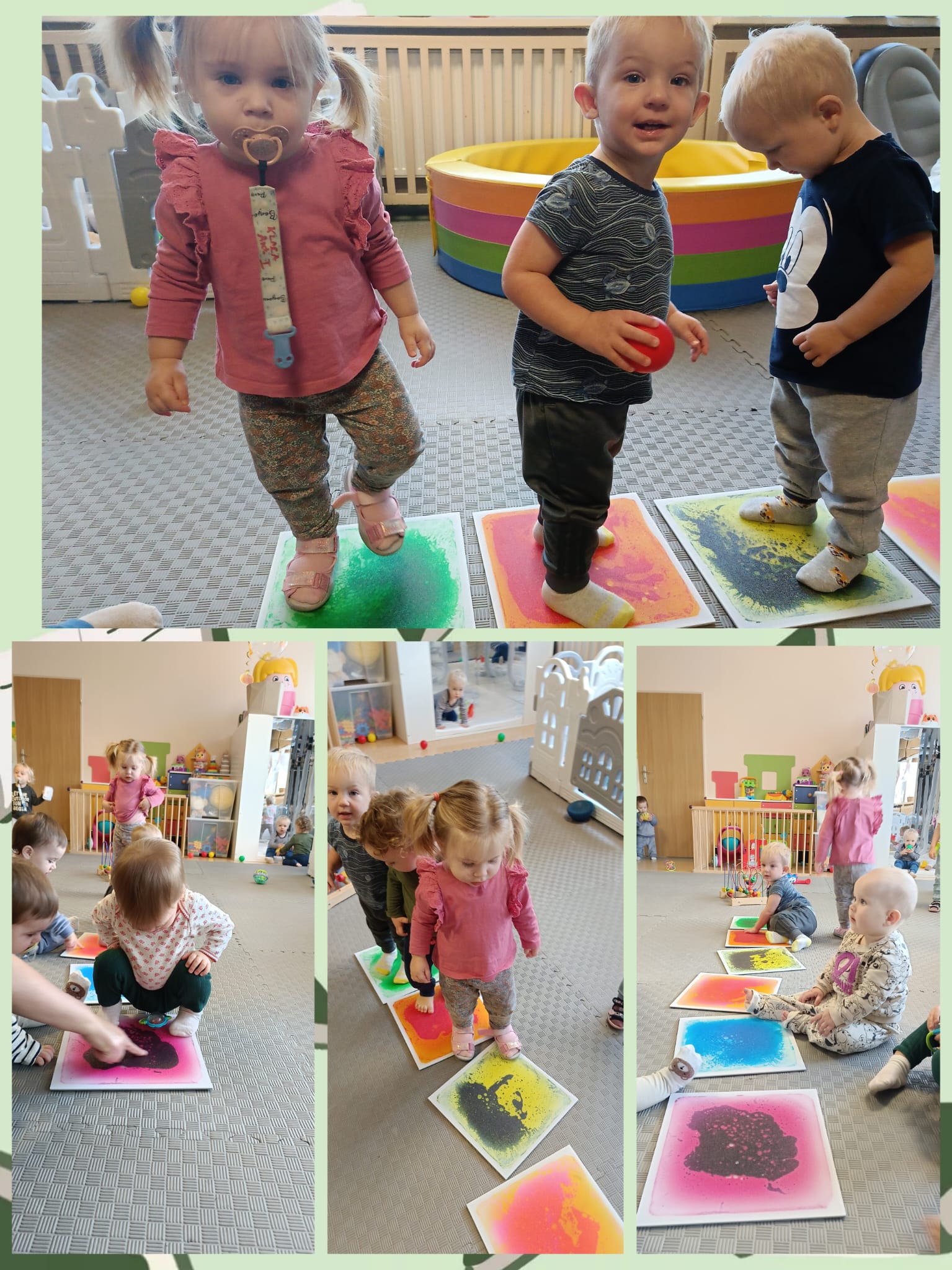 Dzieci uczestniczyły w zajęciach sensorycznych - chodzenie po matach wypełnionych kolorami.