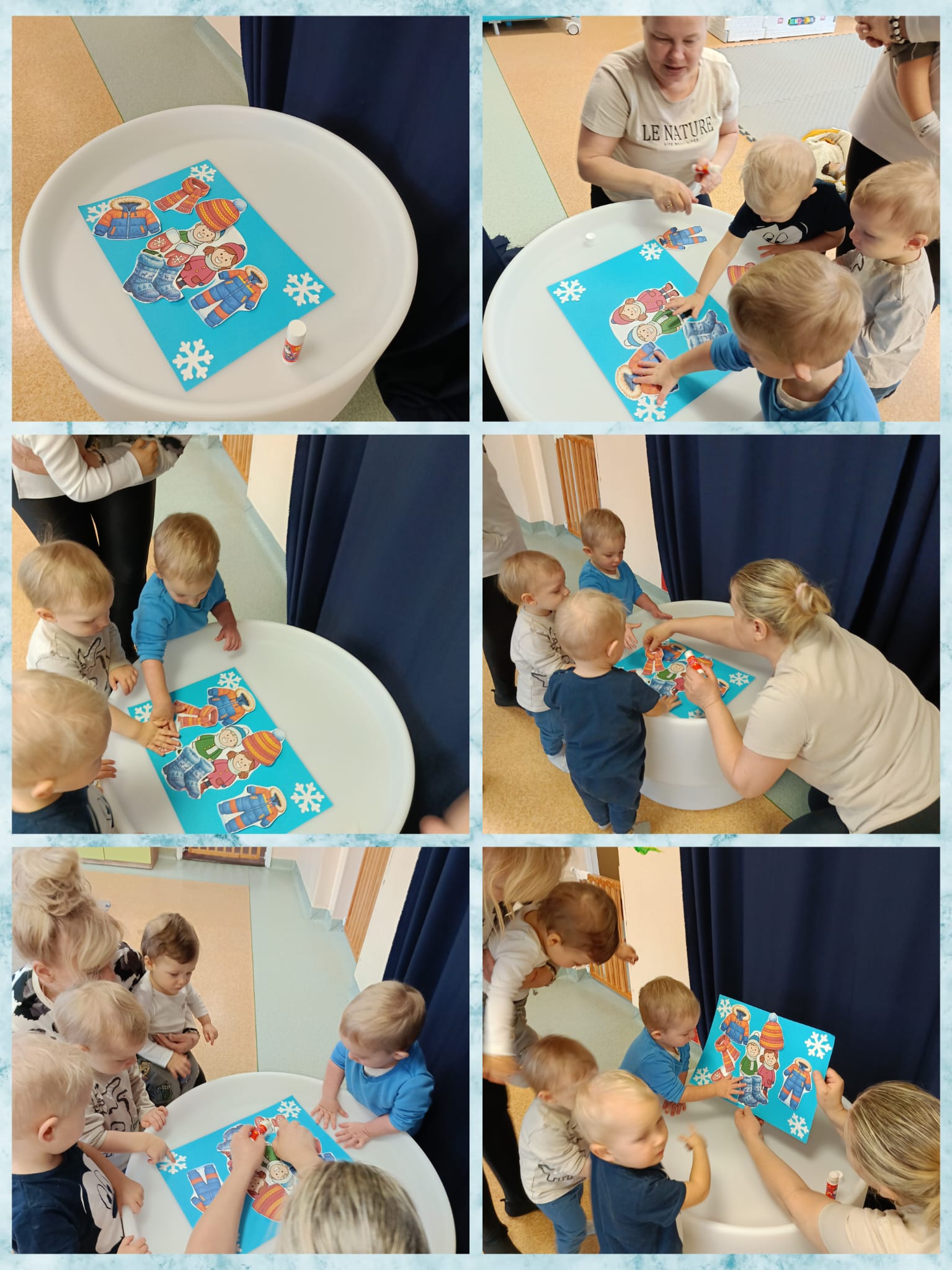 Maluszki w trakcie zabawy uczyły się jak zimą dbać o zdrowie i ciepło się ubierać. Wykonały wspólnie pracę plastyczną