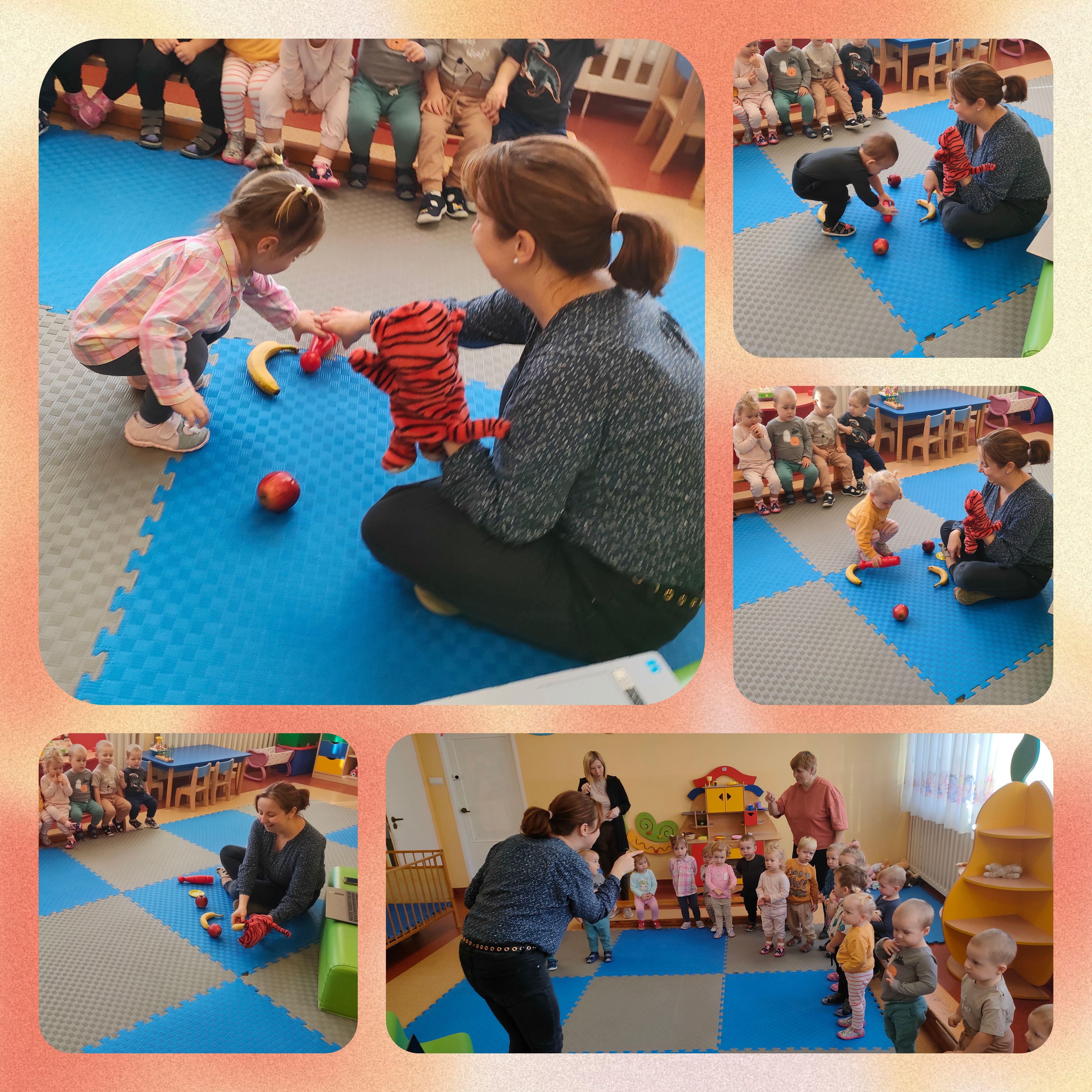 Jak co wtorek odwiedza nas pani z języka angielskiego. Dzieci poznały w tym języku kolor żółty i czerwony, owoce: jabłko i banan, koło małe, koło duże.