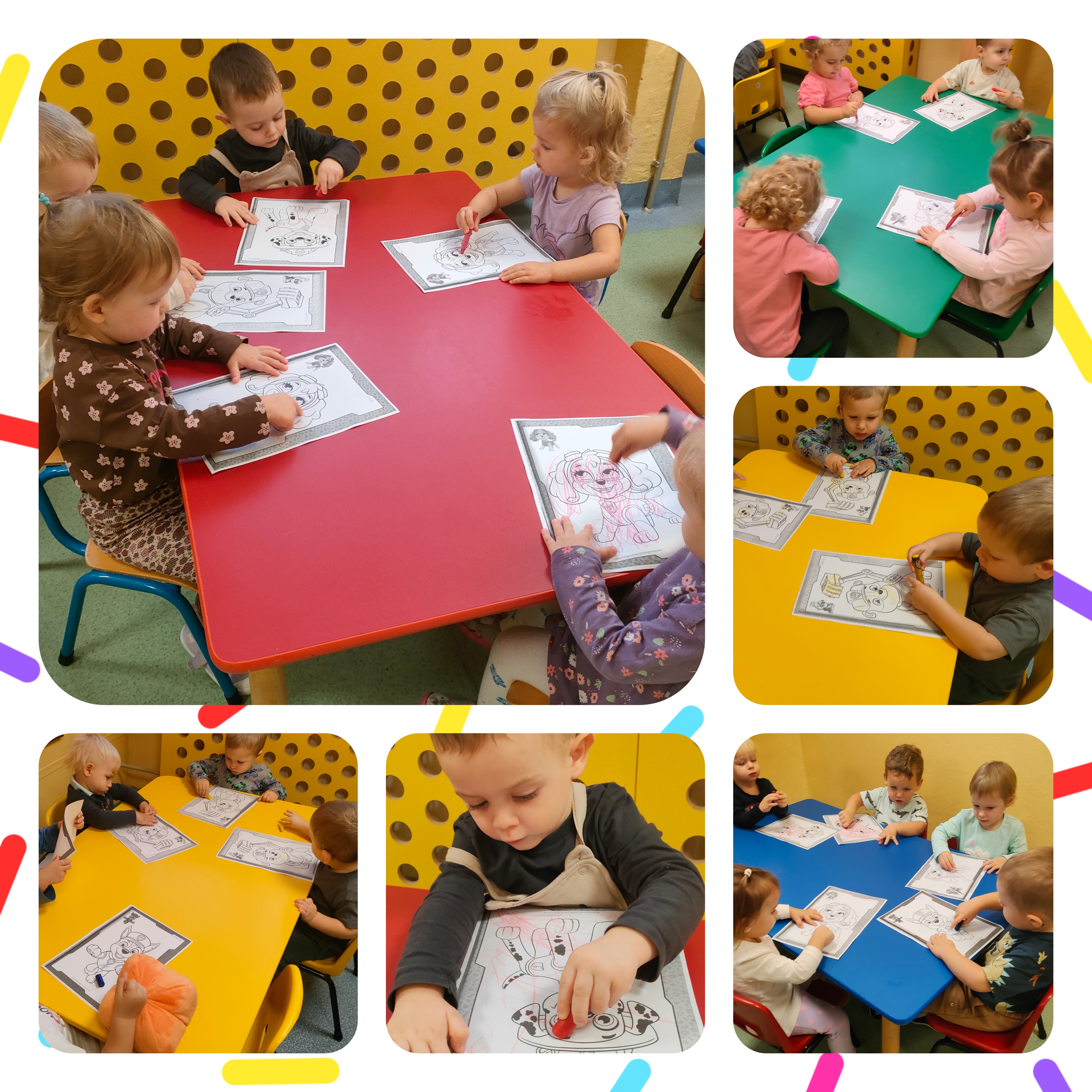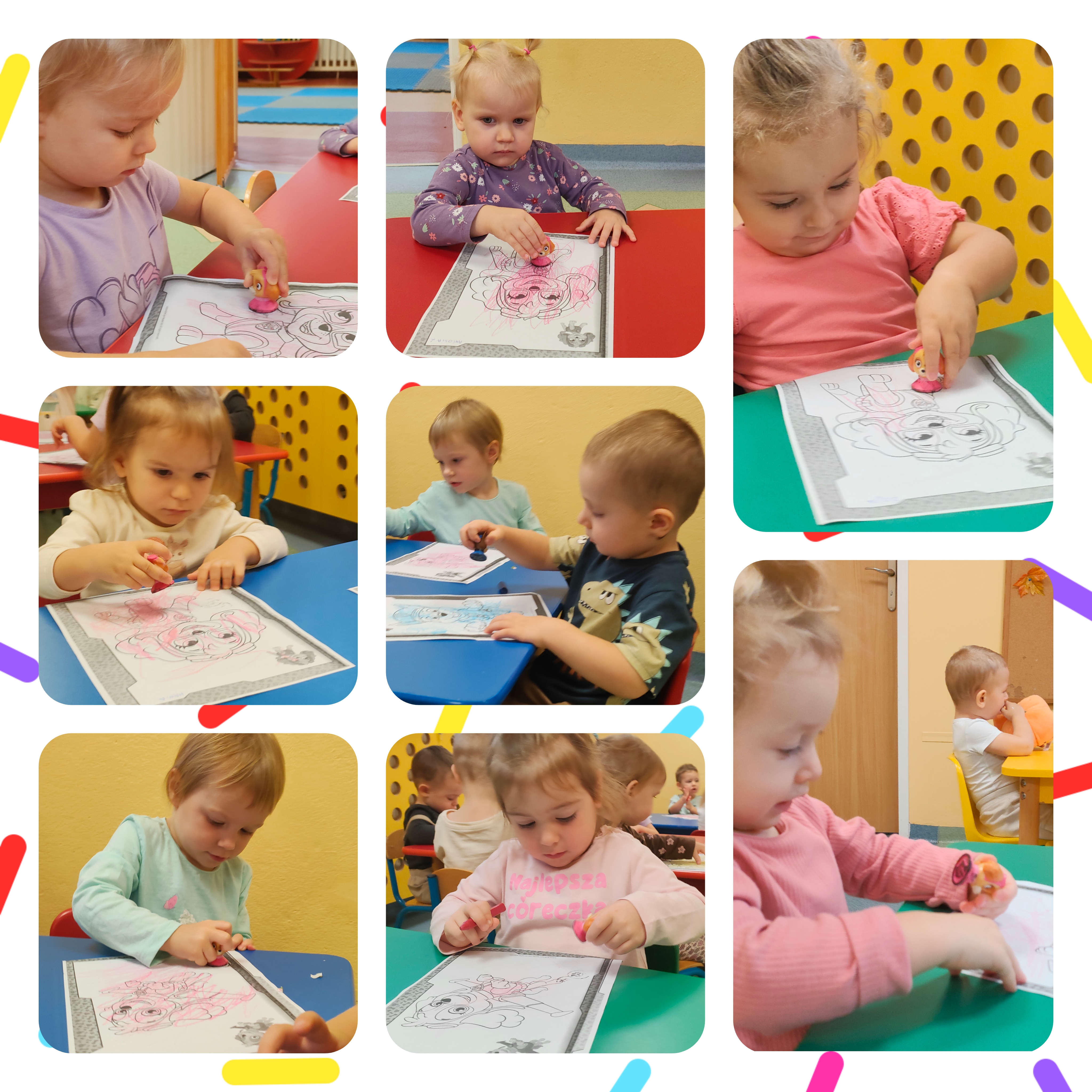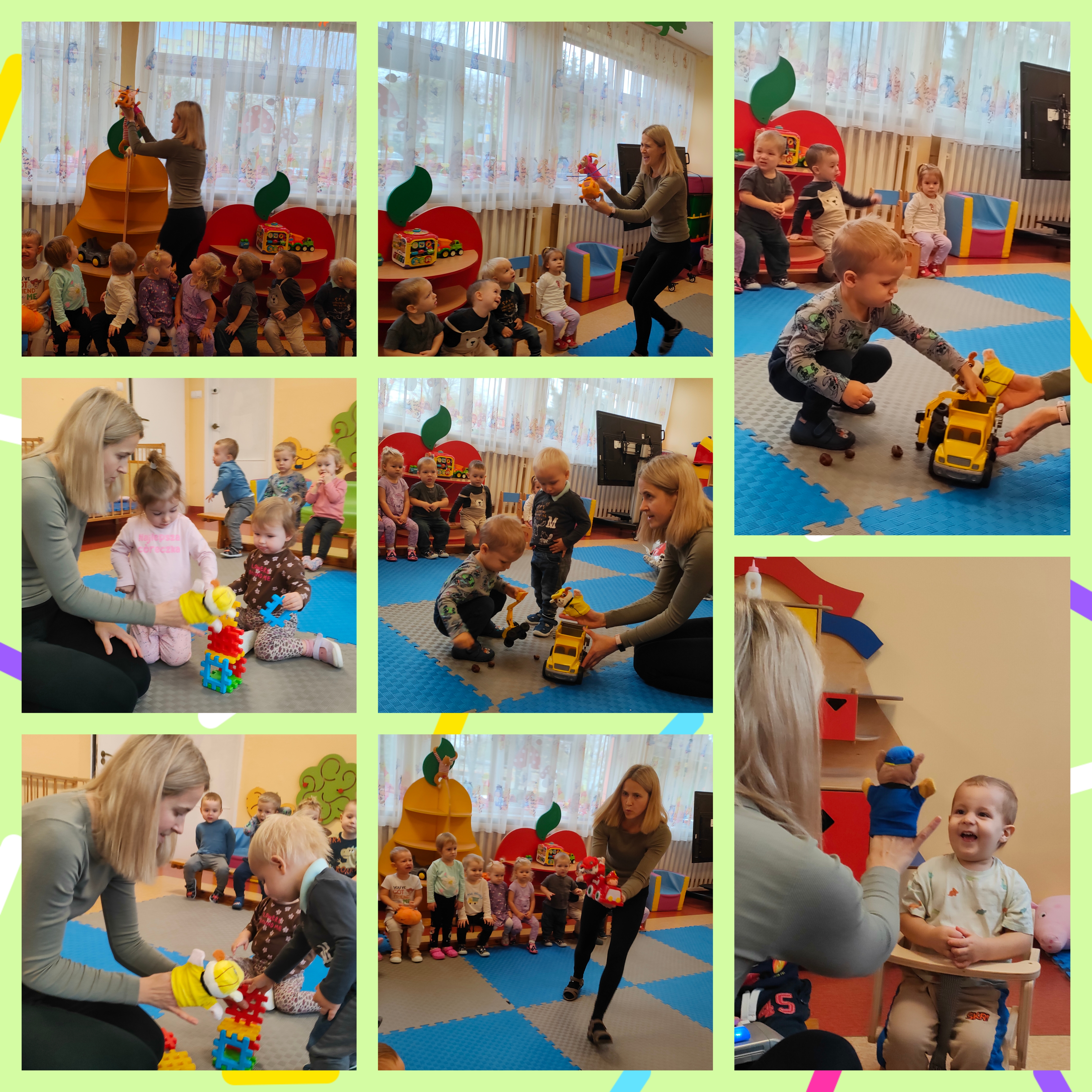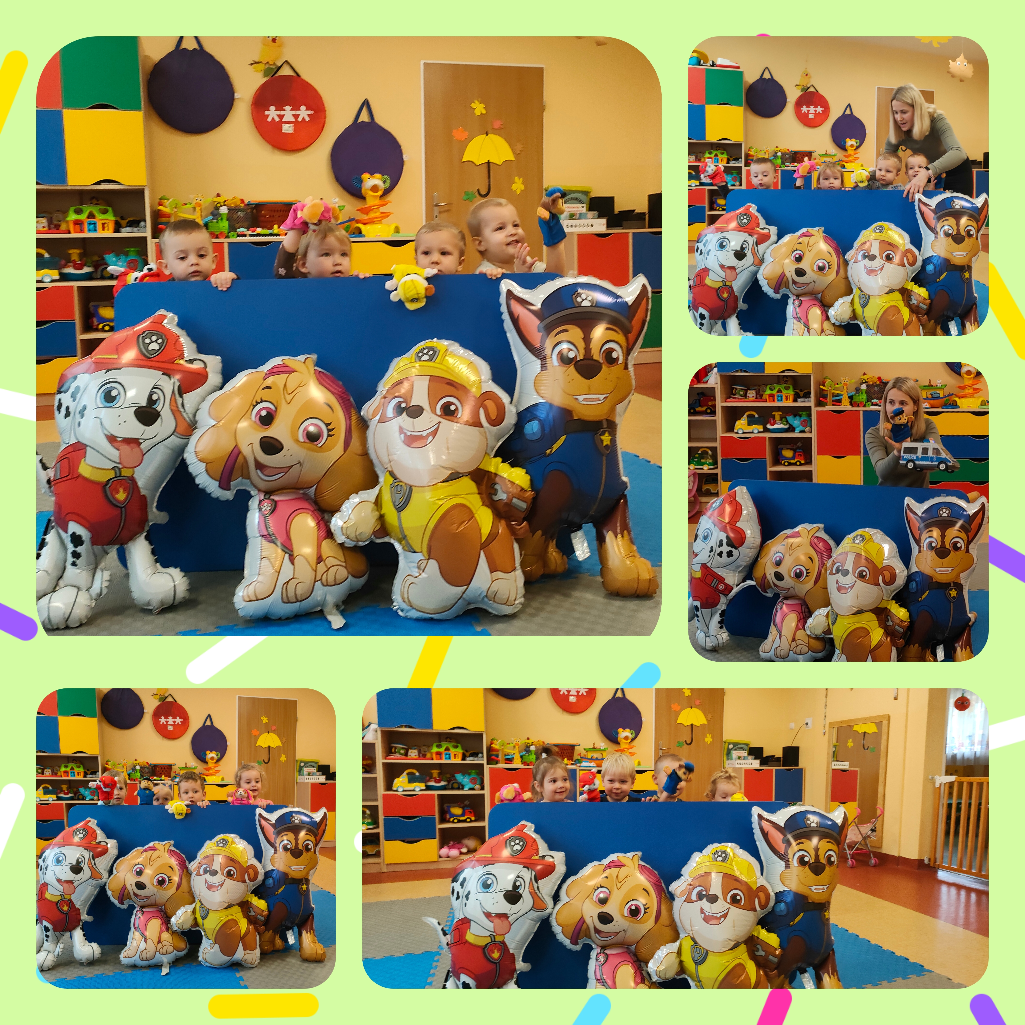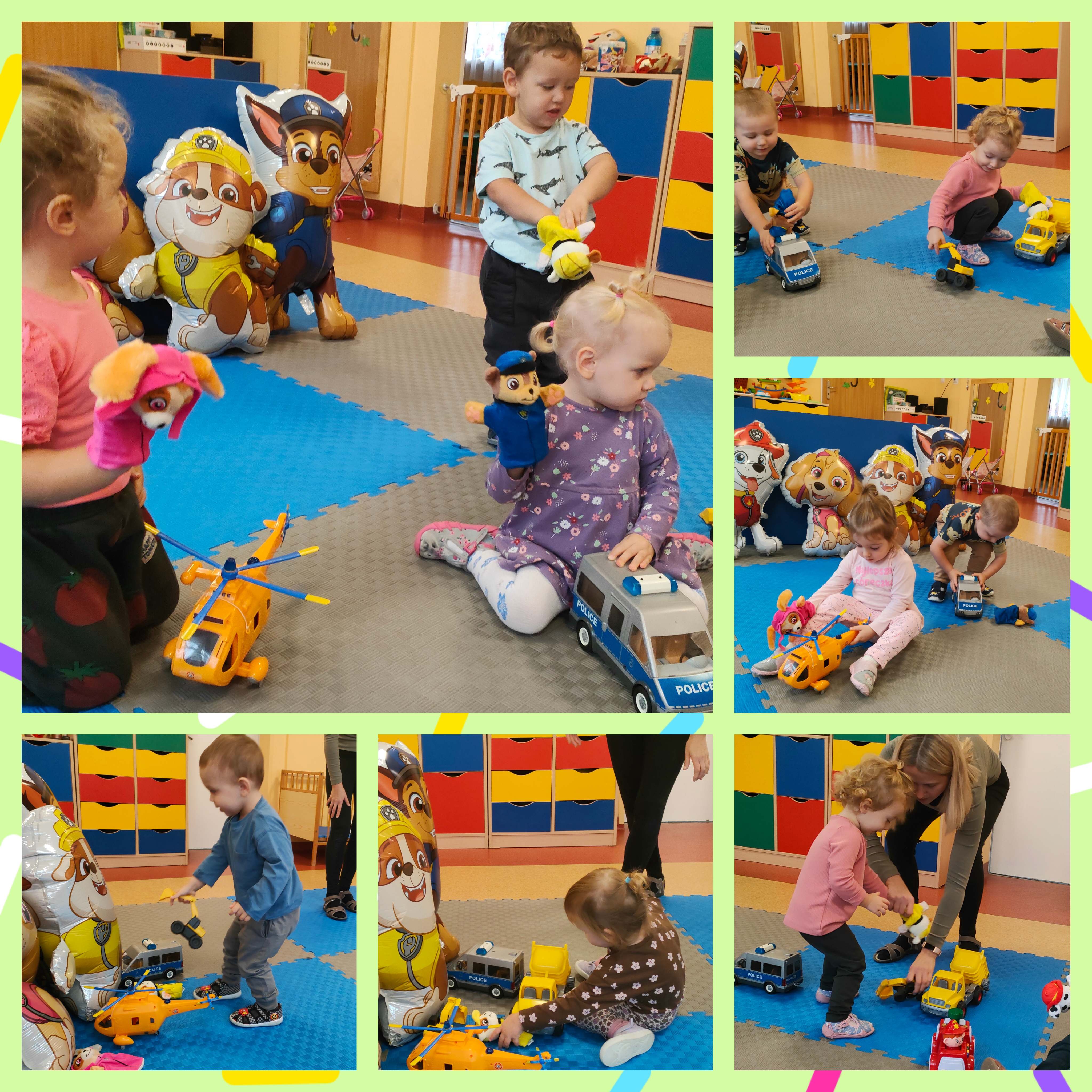 W minionym tygodniu obchodziliśmy Dzień Postaci z bajek. Bajki towarzyszą nam od najmłodszych lat, rozweselają i bawią. Przekazują one również ważne prawdy życiowe. Pamiętajmy, że czytając dzieciom bajki rozwijamy ich wyobraźnię, fantazję, pamięć i wzbogacamy ich słownictwo. Bajkowe postacie sprawiają, że świat dziecka staje się radosny i kolorowy. Nasze maluchy bardzo lubią bohaterów Psiego Patrolu. I to z nimi ostatnio była przednia zabawa. Dzieci oglądały krótkie przedstawienie pacynkowe - "Psi patrol - na ratunek". Miały okazję dopasować pojazd pasujący do określonego pieska i dowiedzieć się, jak ważne jest pomaganie. Mogły same ubrać pacynki na rączki i wcielić się w grę aktorską. Dzieci brały również udział w akcji poszukiwania zaginionych pojazdów piesków - pań opiekunek, które przebrały się za głównych bohaterów. Był Chase, Rubble, Marshall i Sky. Dzieci miały okazję utrwalić kolory piesków. Układały też puzzle i dobierały w pary obrazki przedstawiające Psi patrol. Nie zabrakło także wspólnych tańców i kolorowania. Wzięły również udział w zajęciach sensorycznych w kiślu. Dzieci wyciągały figurki Psiego Patrolu, nalewały, przelewały kisiel. Miały okazję na zabawę wielozmysłową. Mogły poczuć konsystencję kiślu, powąchać posmakować go.