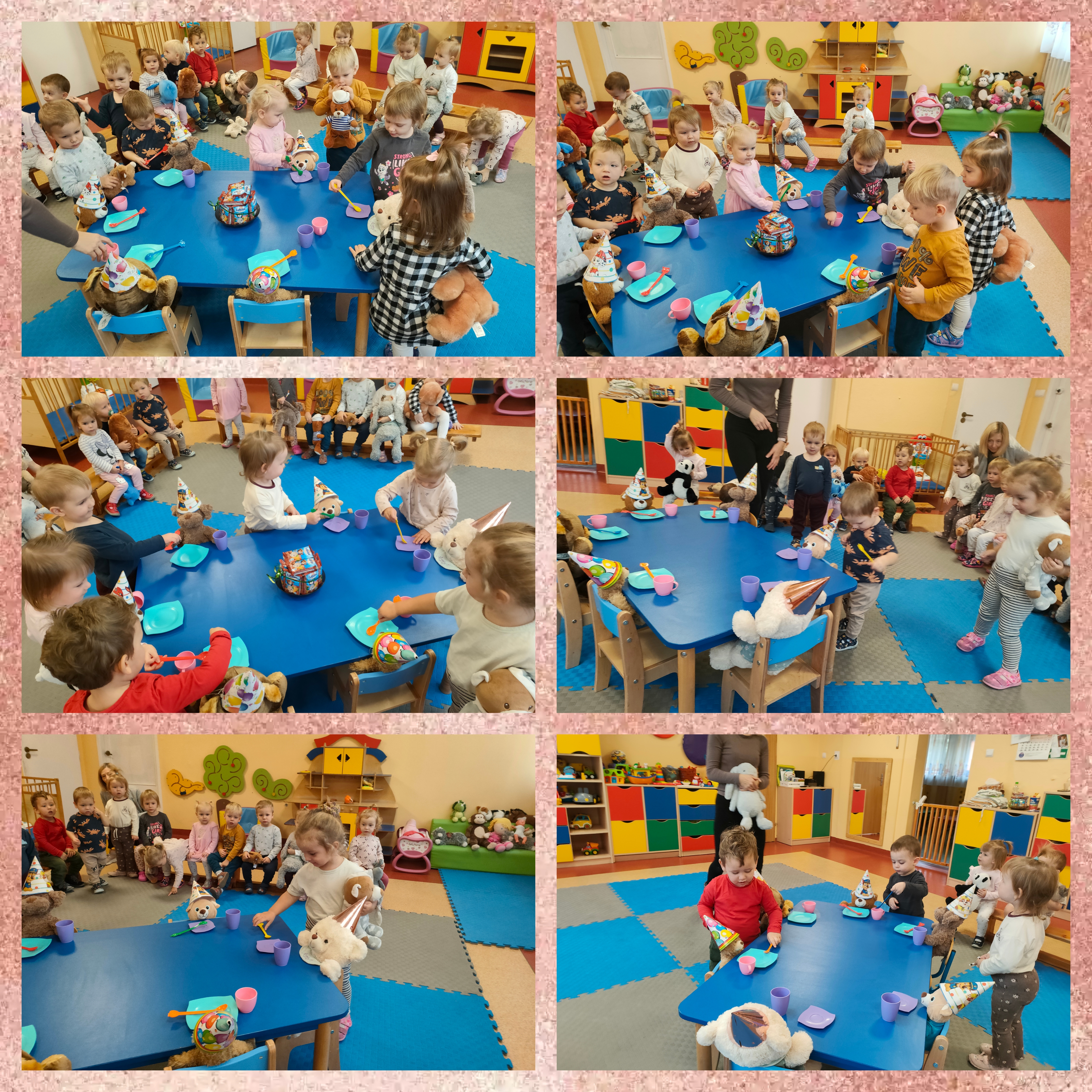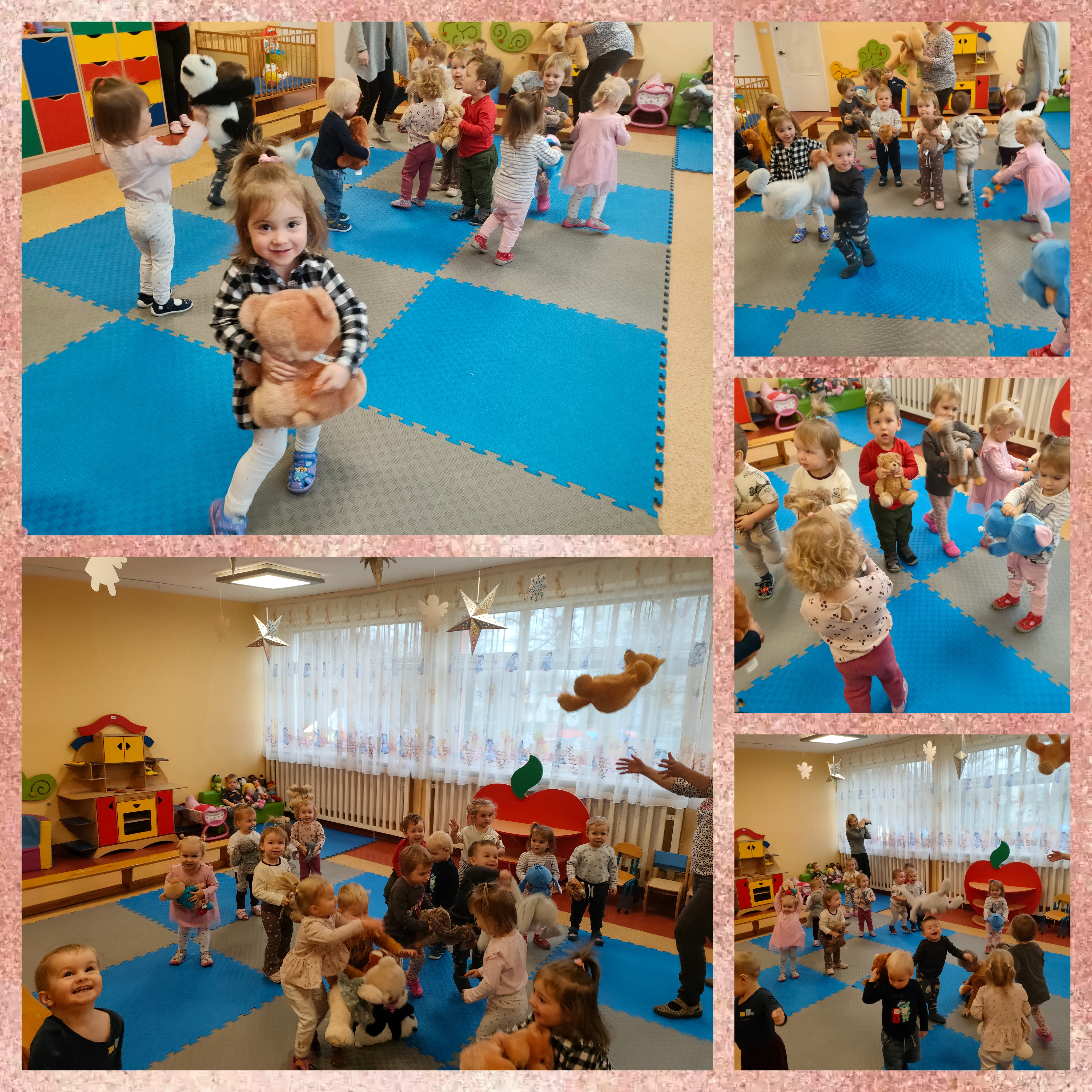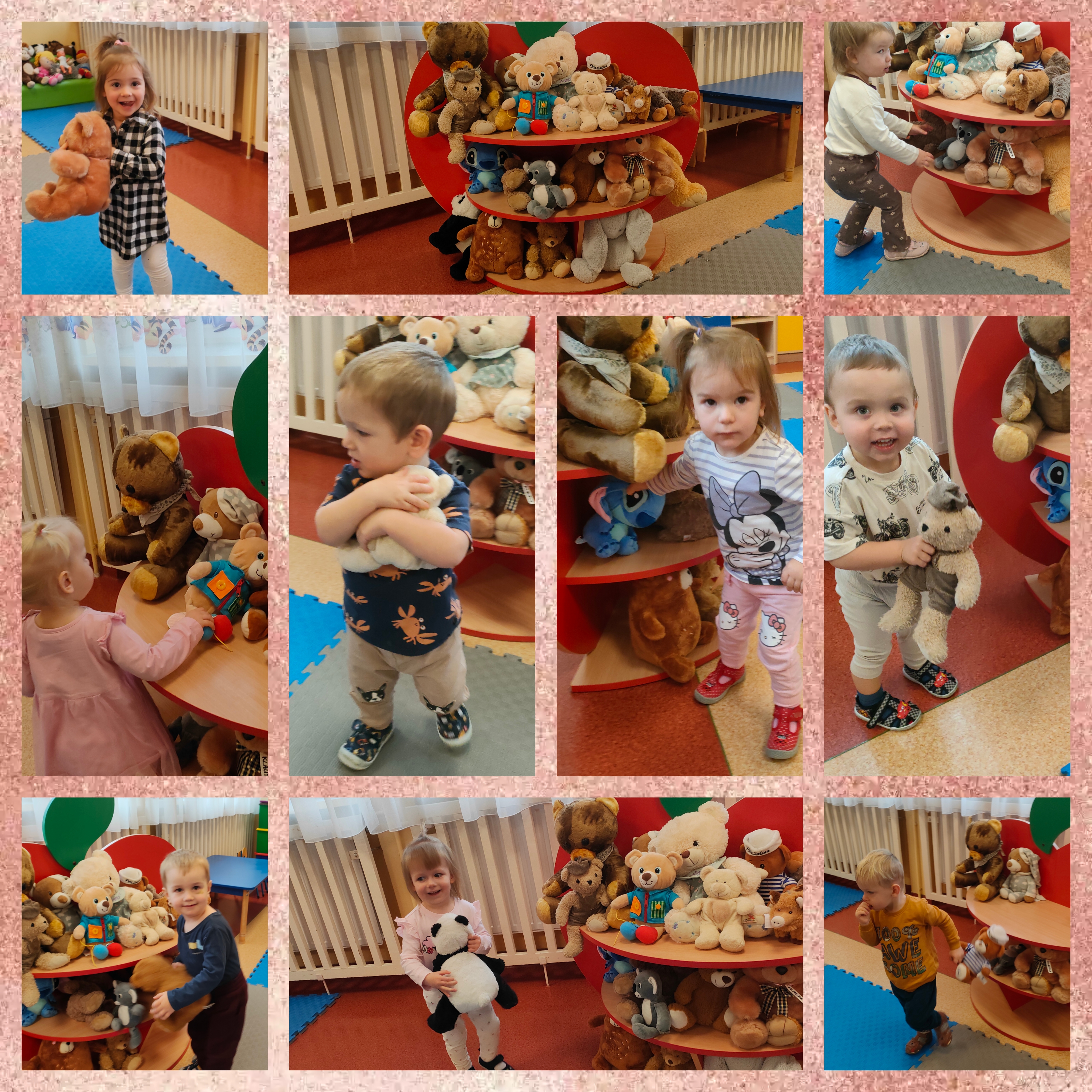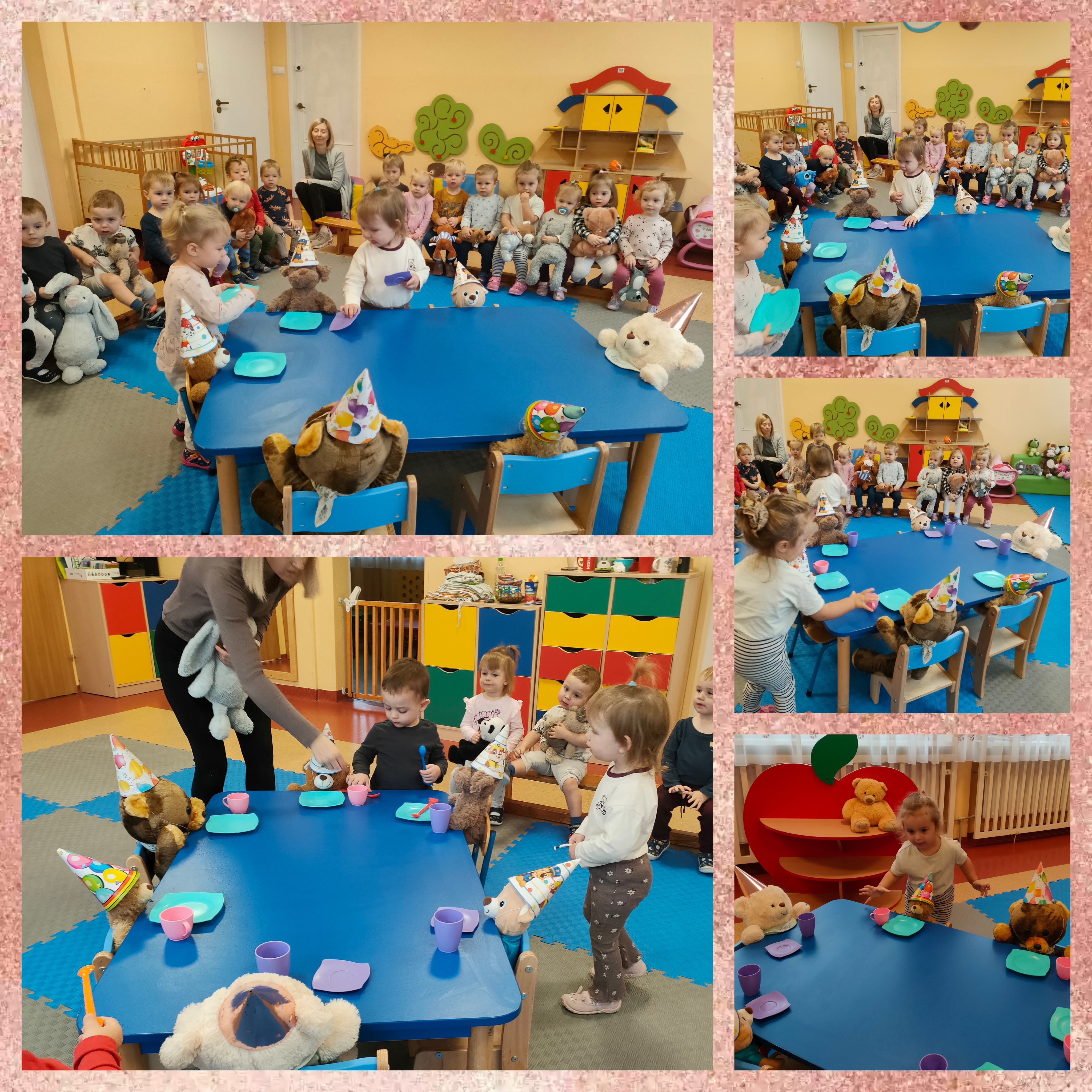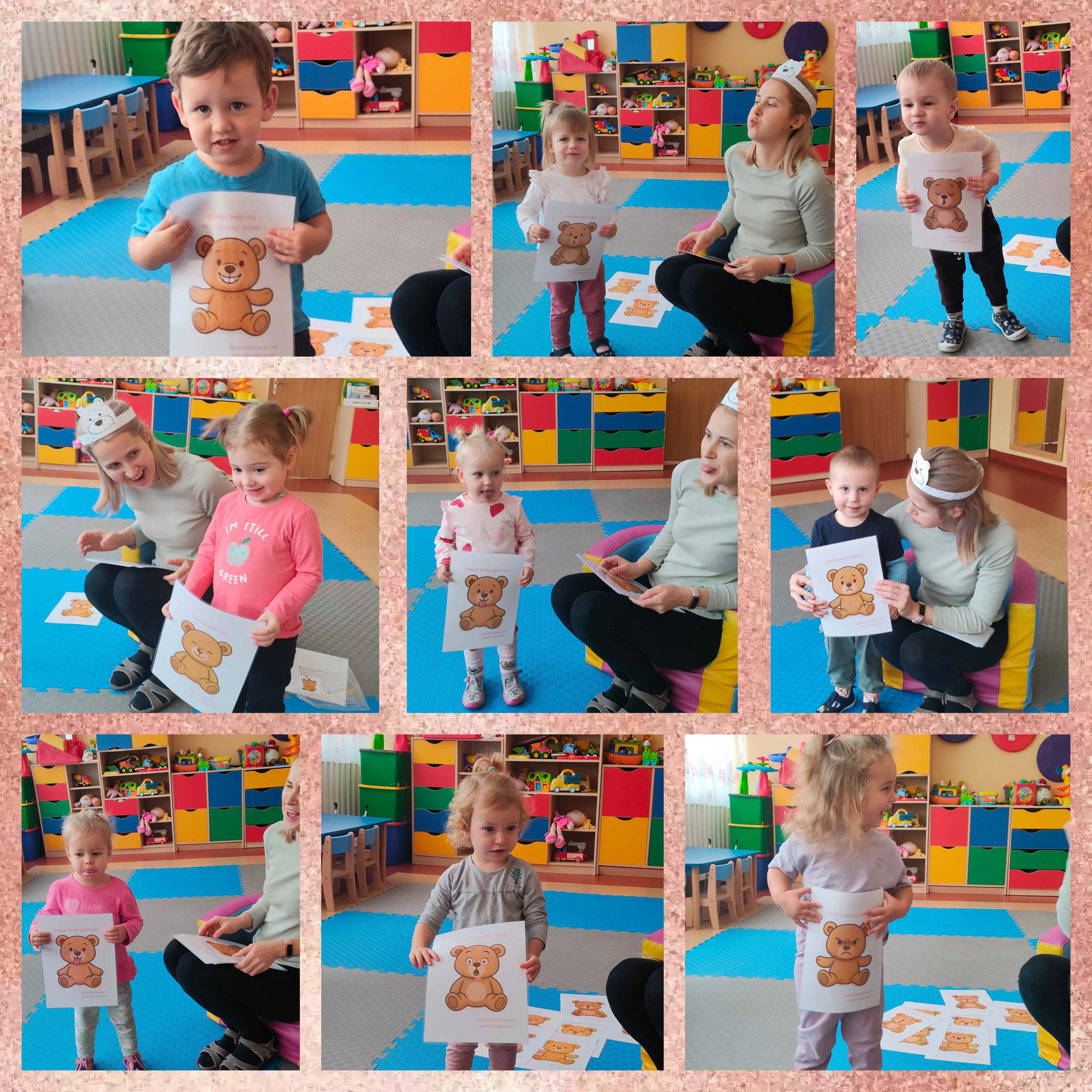 W naszej grupie Święto Pluszowego Misia obchodzone było szczególnie. Tego dnia każde dziecko przyszło do żłobka ze swoim milutkim przyjacielem, by wspólnie z innymi celebrować te pełne radości chwile. Na dzieci i misie czekało wiele atrakcji. Maluszki poznały krótką historię misia z wiersza "Naprawimy misia" C. Janczarskiego. Wiersz opiera się na motywie naprawiania i troski o uszkodzoną zabawkę. Dzieci uczą się, że nie trzeba wyrzucać zepsutych zabawek, ponieważ można je naprawić i cieszyć się nimi dalej. Można też wiersz odczytywać jako symbol dbania o relacje, przyjaźń i wsparcie w trudnych chwilach. Maluszki uczestniczyły także w zabawach ruchowych i zręcznościowych. Bawiły się chustą animacyjną. Turlały kulkami do paszczy misia. Przypinały spinacze do papierowej głowy misia, ćwicząc motorykę małą. Dzieci urządziły misiom przyjęcie urodzinowe. Uczyły się, w jaki sposób prawidłowo ułożyć naczynia i sztućce na stole. Każde dziecko miało okazję samo nakryć do stołu. Maluszki posadziły misie przy stole i je nakarmiły. Nie obyło się bez gromkiego "Sto lat" dla pluszowych solenizantów. Takie role uczą dzieci zasad społecznych, takich jak grzeczność i szacunek dla innych. Maluszki wykonały również przepiękne prace plastyczne z misiem w roli głównej. Dla pełnego rozwoju dziecka niezmiernie ważna jest orientacja przestrzenna, która towarzyszy mu codziennie w otaczającej rzeczywistości. Dlatego dzieci umieszczały misia według instrukcji opiekunki (na, pod, za, przed krzesłem). Dużo emocji dostarczyły dzieciom misiowe ćwiczenia buzi i języka, ćwiczenia oddechowe – dmuchanie przez usta i degustacja chrupek oblanych miodem. Mamy nadzieję, że misiowy tydzień na długo pozostanie we wspomnieniach dzieci. Ponad to dzieci uczestniczyły w zajęciach profilaktycznych - Zdrowe ząbki. Z panią pielęgniarką myły ząbki. Jak w każdy wtorek gościmy panią od angielskiego, która uczy nasze maluszki nowych słówek.