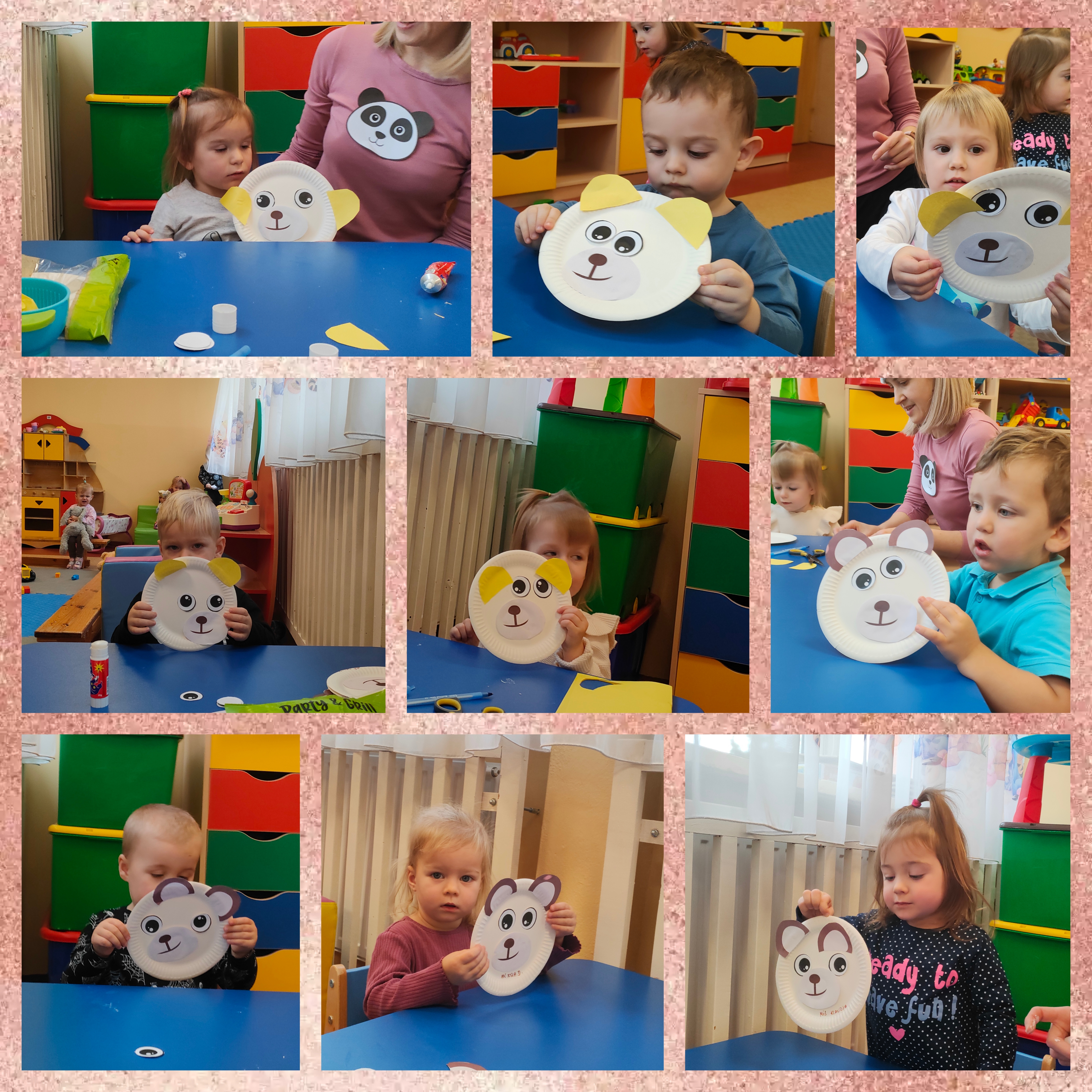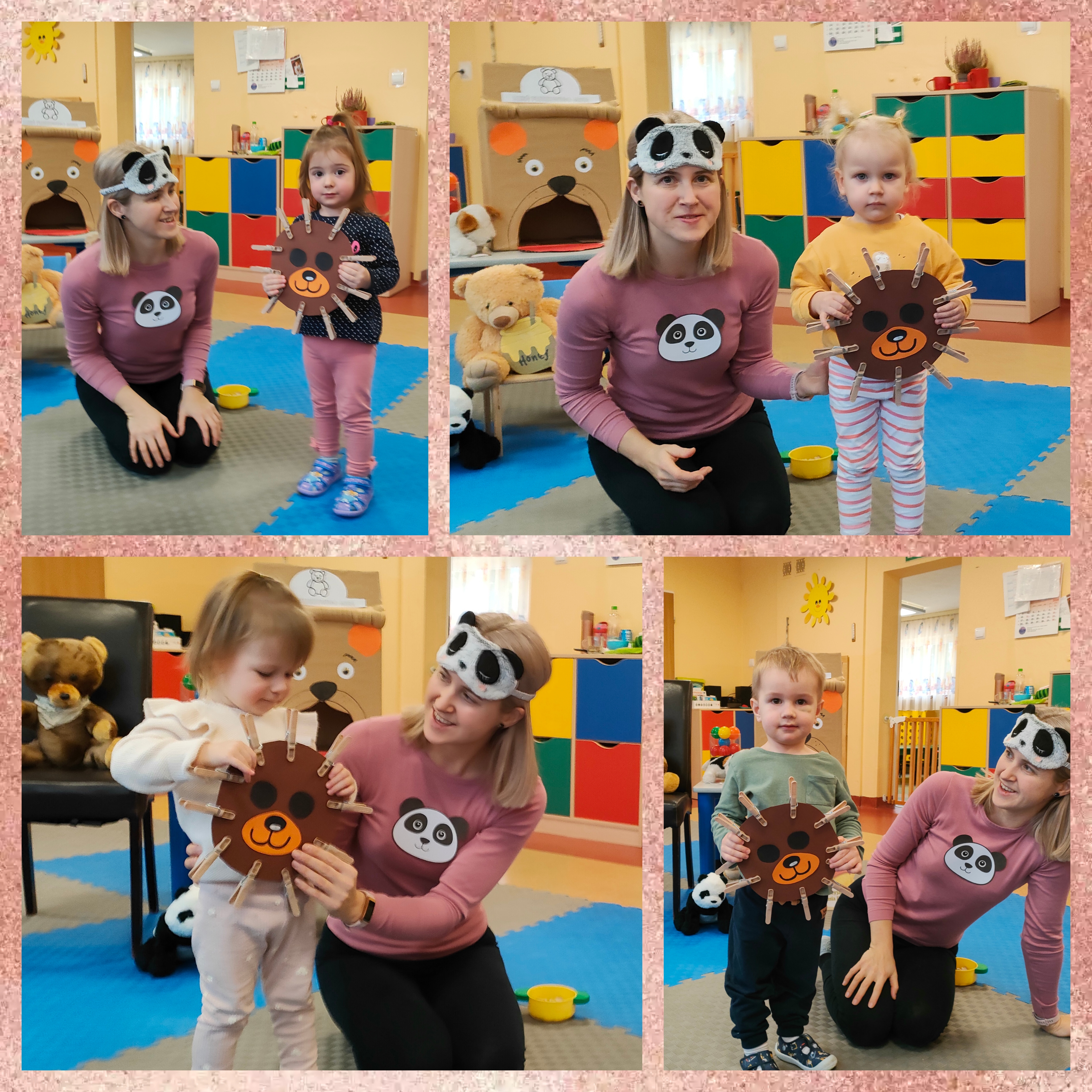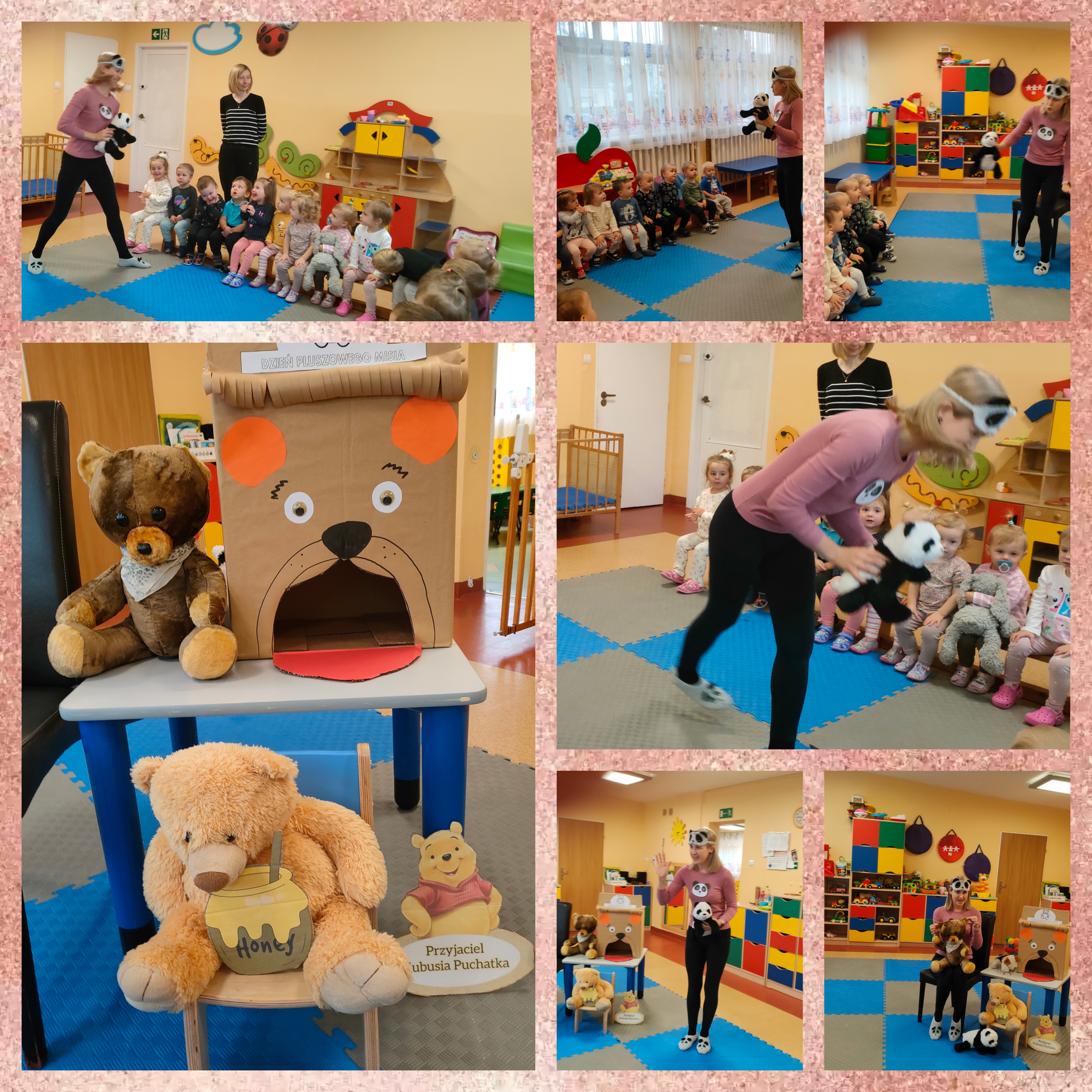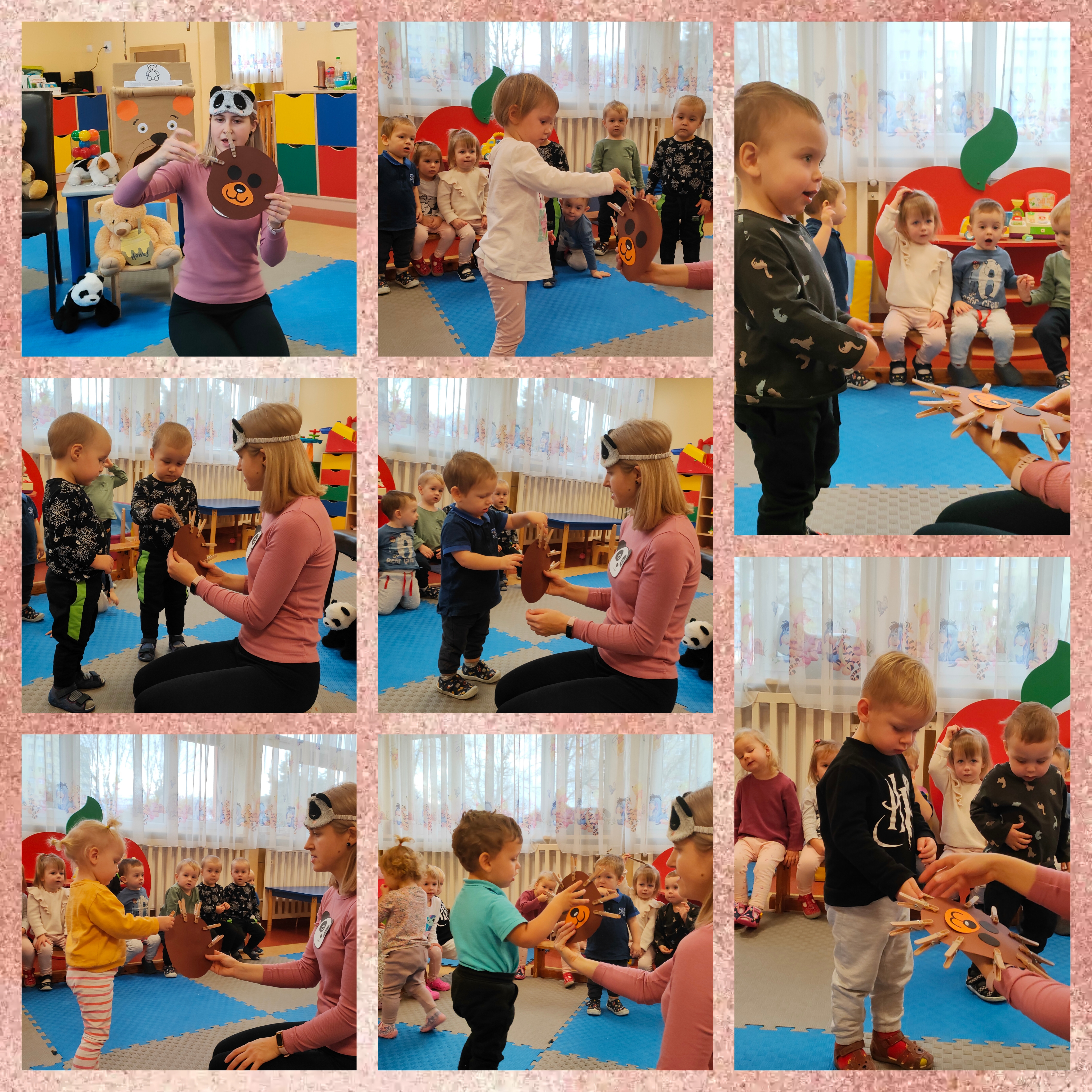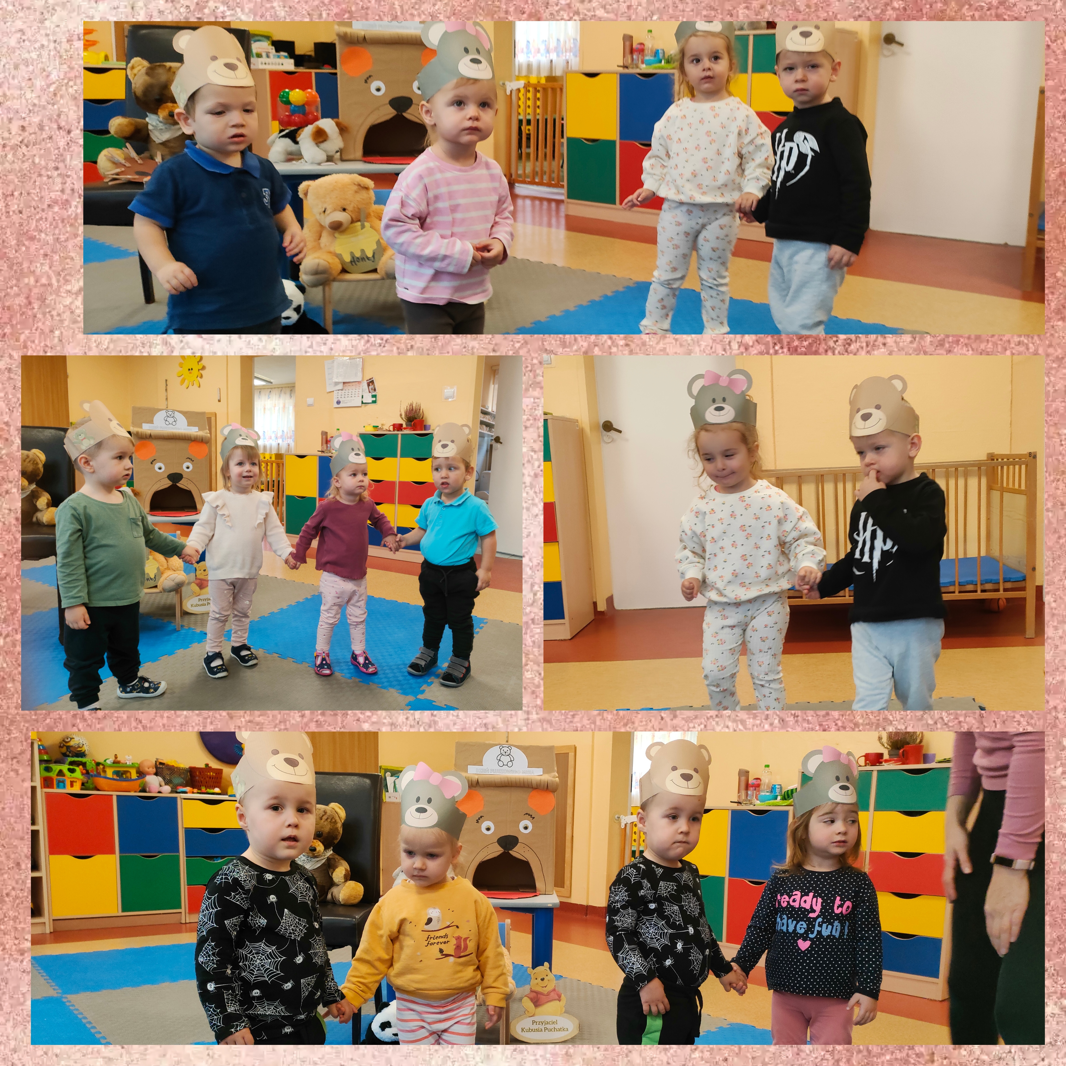 W naszej grupie Święto Pluszowego Misia obchodzone było szczególnie. Tego dnia każde dziecko przyszło do żłobka ze swoim milutkim przyjacielem, by wspólnie z innymi celebrować te pełne radości chwile. Na dzieci i misie czekało wiele atrakcji. Maluszki poznały krótką historię misia z wiersza "Naprawimy misia" C. Janczarskiego. Wiersz opiera się na motywie naprawiania i troski o uszkodzoną zabawkę. Dzieci uczą się, że nie trzeba wyrzucać zepsutych zabawek, ponieważ można je naprawić i cieszyć się nimi dalej. Można też wiersz odczytywać jako symbol dbania o relacje, przyjaźń i wsparcie w trudnych chwilach. Maluszki uczestniczyły także w zabawach ruchowych i zręcznościowych. Bawiły się chustą animacyjną. Turlały kulkami do paszczy misia. Przypinały spinacze do papierowej głowy misia, ćwicząc motorykę małą. Dzieci urządziły misiom przyjęcie urodzinowe. Uczyły się, w jaki sposób prawidłowo ułożyć naczynia i sztućce na stole. Każde dziecko miało okazję samo nakryć do stołu. Maluszki posadziły misie przy stole i je nakarmiły. Nie obyło się bez gromkiego "Sto lat" dla pluszowych solenizantów. Takie role uczą dzieci zasad społecznych, takich jak grzeczność i szacunek dla innych. Maluszki wykonały również przepiękne prace plastyczne z misiem w roli głównej. Dla pełnego rozwoju dziecka niezmiernie ważna jest orientacja przestrzenna, która towarzyszy mu codziennie w otaczającej rzeczywistości. Dlatego dzieci umieszczały misia według instrukcji opiekunki (na, pod, za, przed krzesłem). Dużo emocji dostarczyły dzieciom misiowe ćwiczenia buzi i języka, ćwiczenia oddechowe – dmuchanie przez usta i degustacja chrupek oblanych miodem. Mamy nadzieję, że misiowy tydzień na długo pozostanie we wspomnieniach dzieci. Ponad to dzieci uczestniczyły w zajęciach profilaktycznych - Zdrowe ząbki. Z panią pielęgniarką myły ząbki. Jak w każdy wtorek gościmy panią od angielskiego, która uczy nasze maluszki nowych słówek.