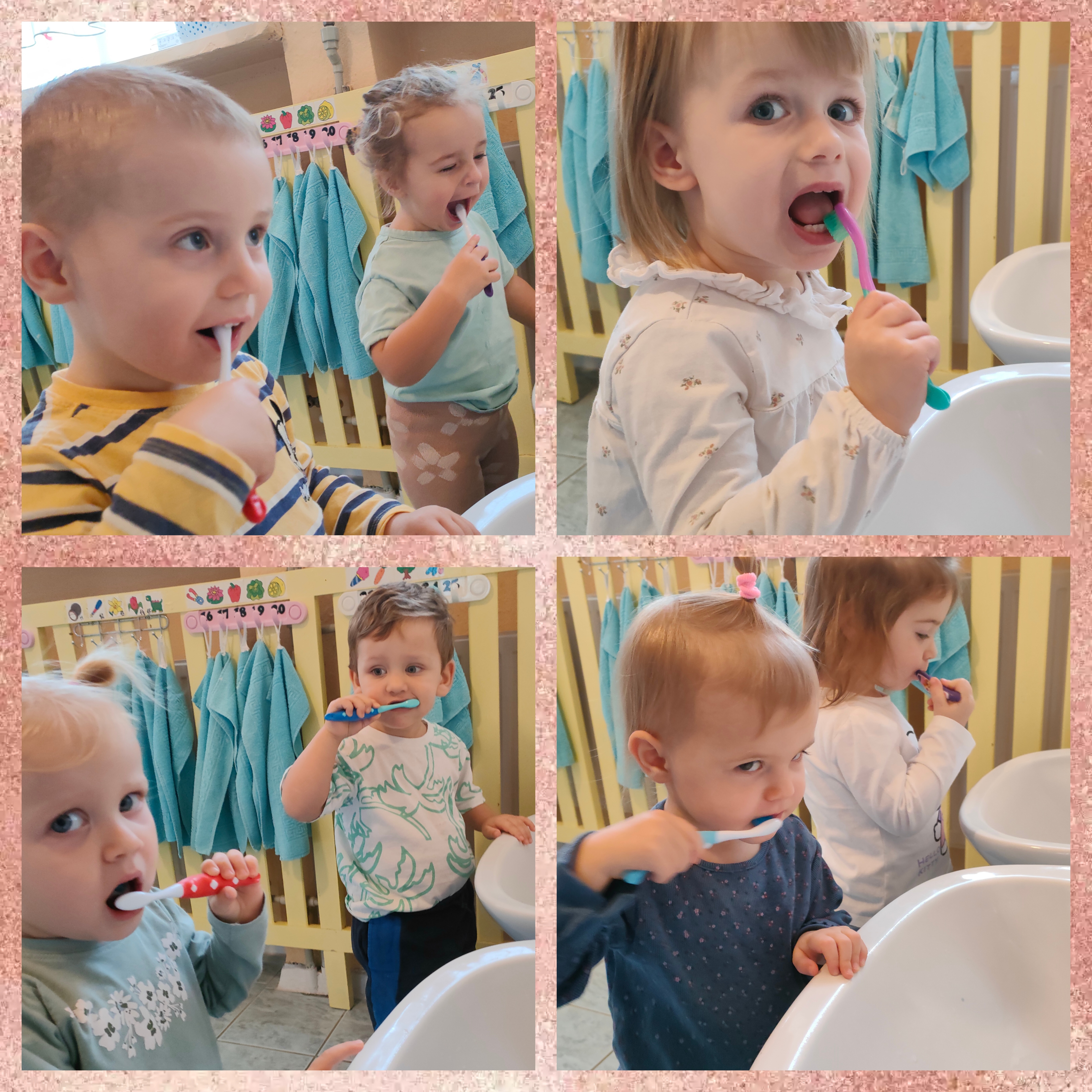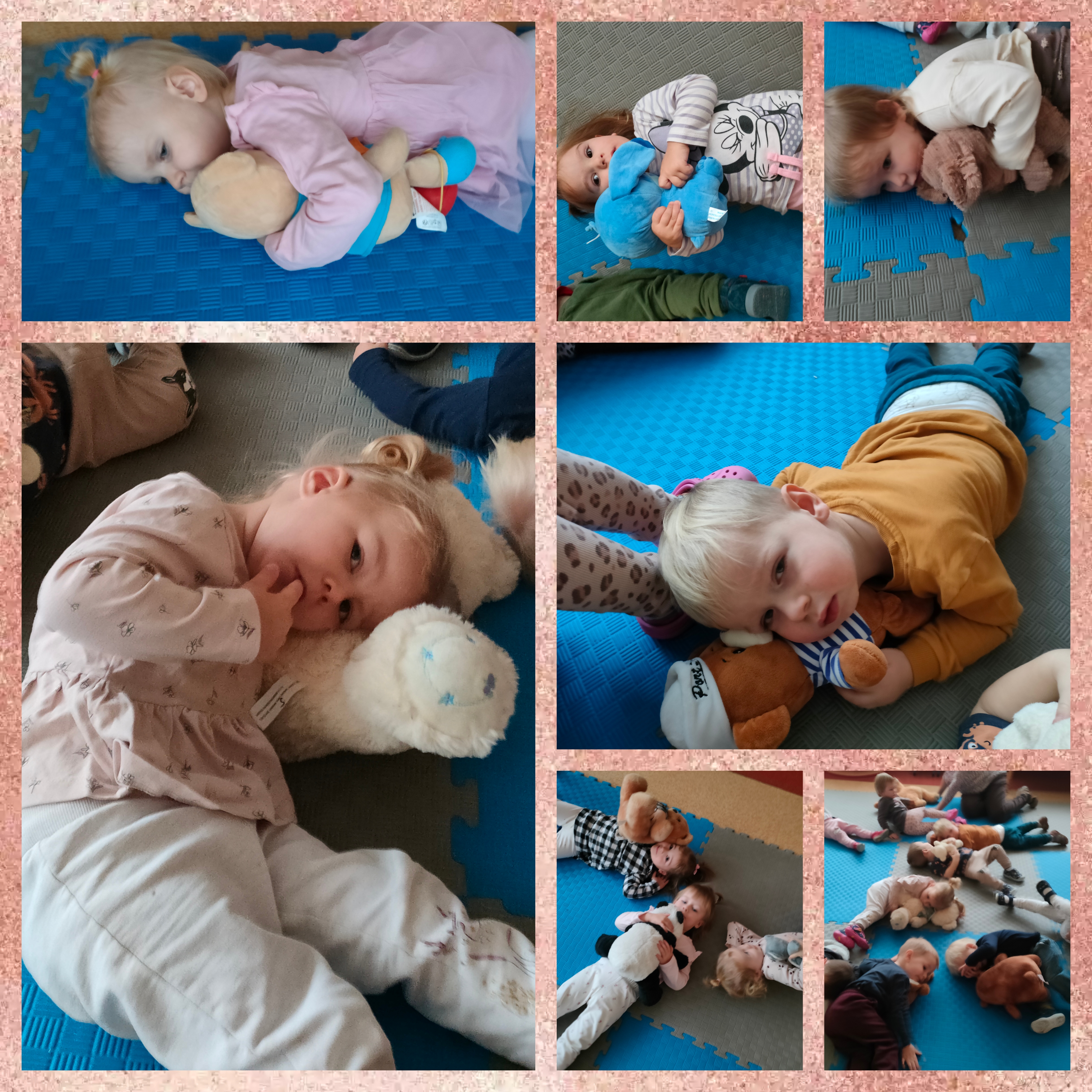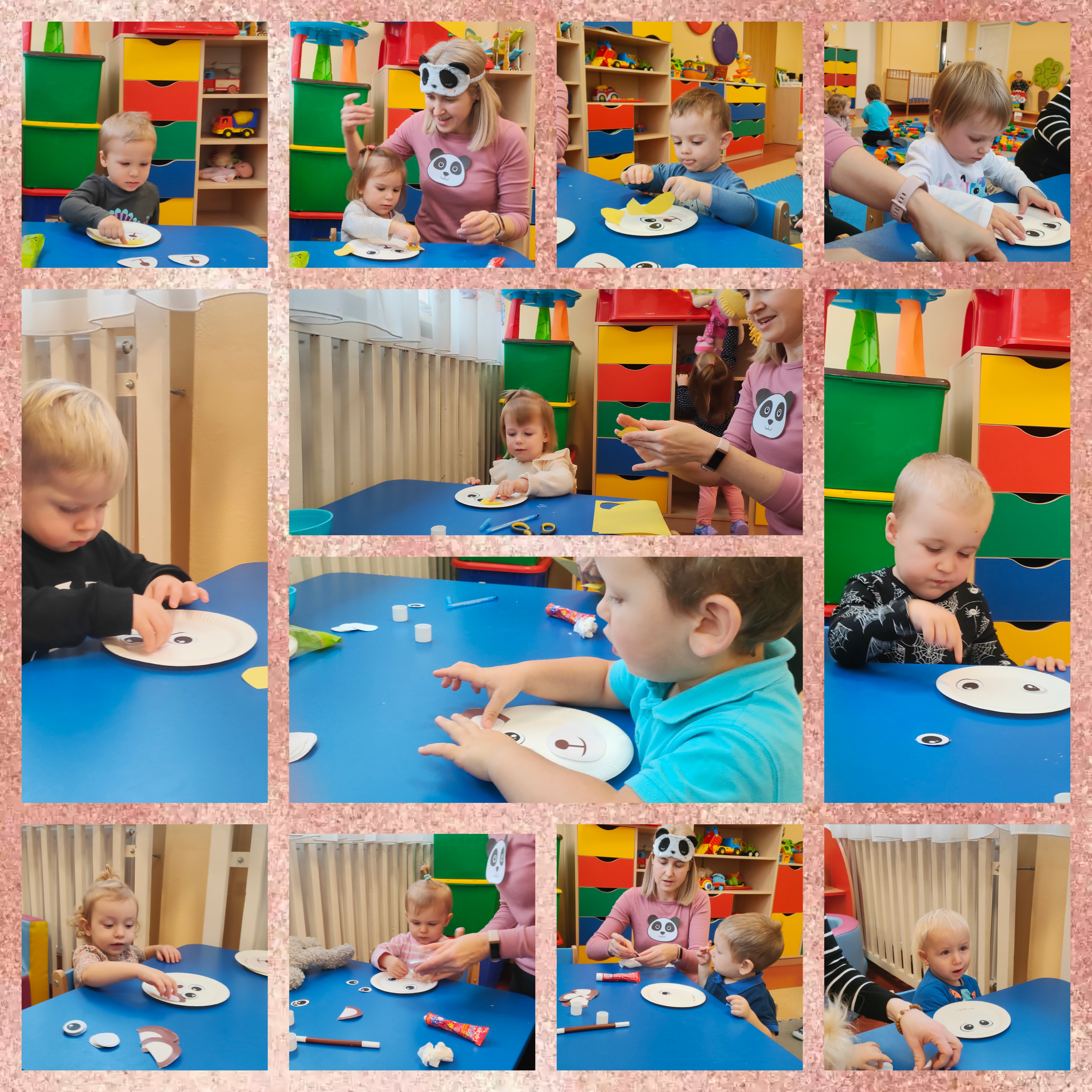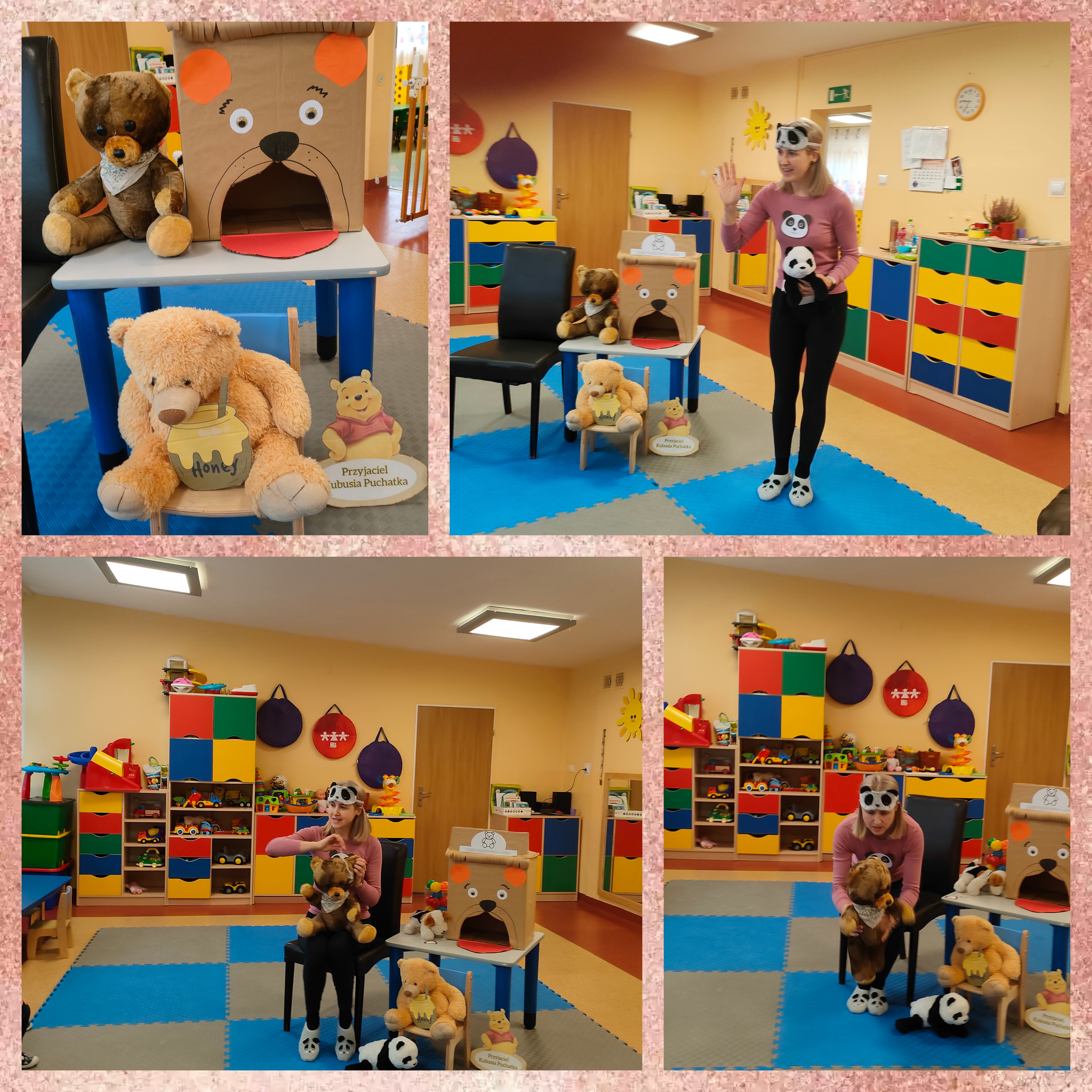 W naszej grupie Święto Pluszowego Misia obchodzone było szczególnie. Tego dnia każde dziecko przyszło do żłobka ze swoim milutkim przyjacielem, by wspólnie z innymi celebrować te pełne radości chwile. Na dzieci i misie czekało wiele atrakcji. Maluszki poznały krótką historię misia z wiersza "Naprawimy misia" C. Janczarskiego. Wiersz opiera się na motywie naprawiania i troski o uszkodzoną zabawkę. Dzieci uczą się, że nie trzeba wyrzucać zepsutych zabawek, ponieważ można je naprawić i cieszyć się nimi dalej. Można też wiersz odczytywać jako symbol dbania o relacje, przyjaźń i wsparcie w trudnych chwilach. Maluszki uczestniczyły także w zabawach ruchowych i zręcznościowych. Bawiły się chustą animacyjną. Turlały kulkami do paszczy misia. Przypinały spinacze do papierowej głowy misia, ćwicząc motorykę małą. Dzieci urządziły misiom przyjęcie urodzinowe. Uczyły się, w jaki sposób prawidłowo ułożyć naczynia i sztućce na stole. Każde dziecko miało okazję samo nakryć do stołu. Maluszki posadziły misie przy stole i je nakarmiły. Nie obyło się bez gromkiego "Sto lat" dla pluszowych solenizantów. Takie role uczą dzieci zasad społecznych, takich jak grzeczność i szacunek dla innych. Maluszki wykonały również przepiękne prace plastyczne z misiem w roli głównej. Dla pełnego rozwoju dziecka niezmiernie ważna jest orientacja przestrzenna, która towarzyszy mu codziennie w otaczającej rzeczywistości. Dlatego dzieci umieszczały misia według instrukcji opiekunki (na, pod, za, przed krzesłem). Dużo emocji dostarczyły dzieciom misiowe ćwiczenia buzi i języka, ćwiczenia oddechowe – dmuchanie przez usta i degustacja chrupek oblanych miodem. Mamy nadzieję, że misiowy tydzień na długo pozostanie we wspomnieniach dzieci. Ponad to dzieci uczestniczyły w zajęciach profilaktycznych - Zdrowe ząbki. Z panią pielęgniarką myły ząbki. Jak w każdy wtorek gościmy panią od angielskiego, która uczy nasze maluszki nowych słówek.