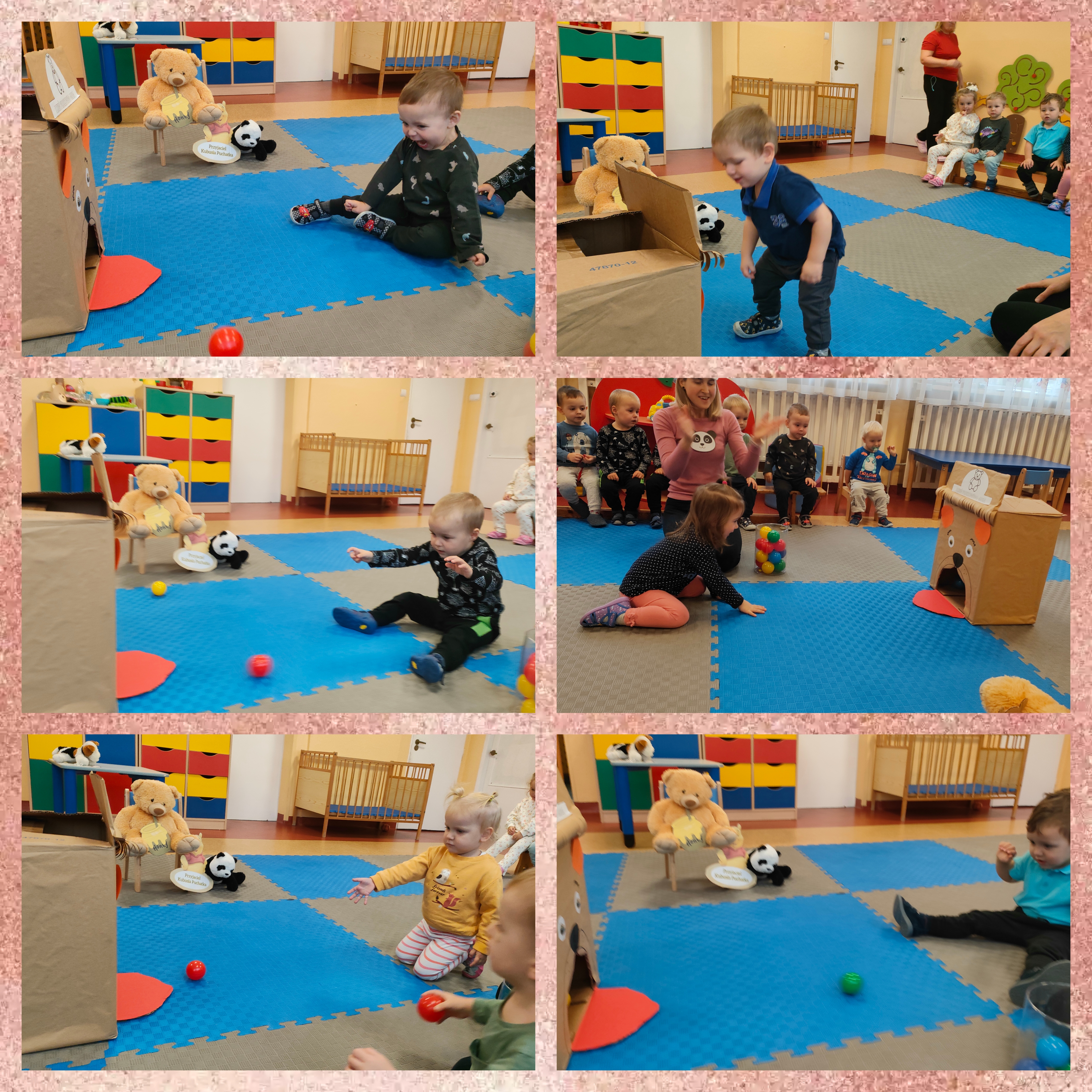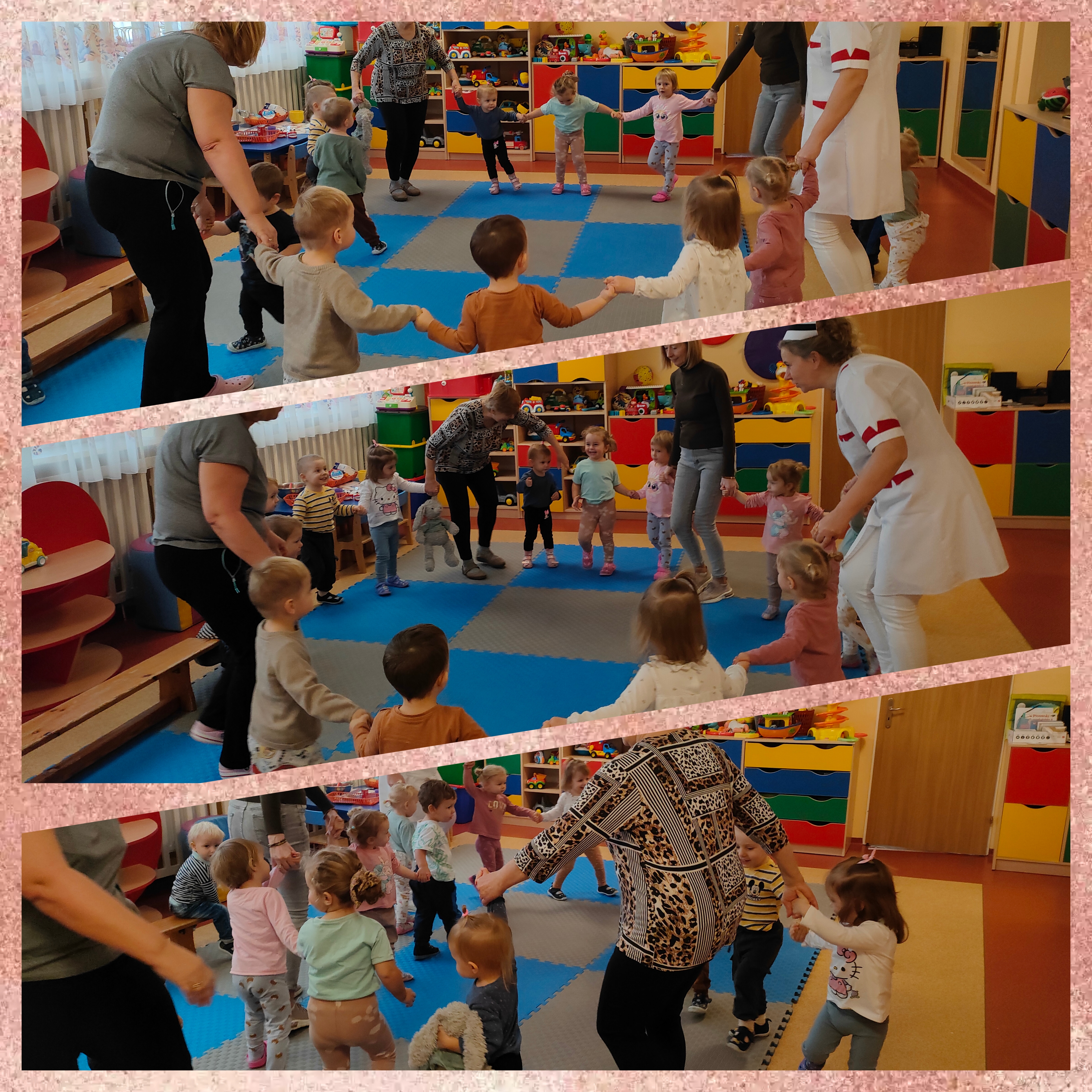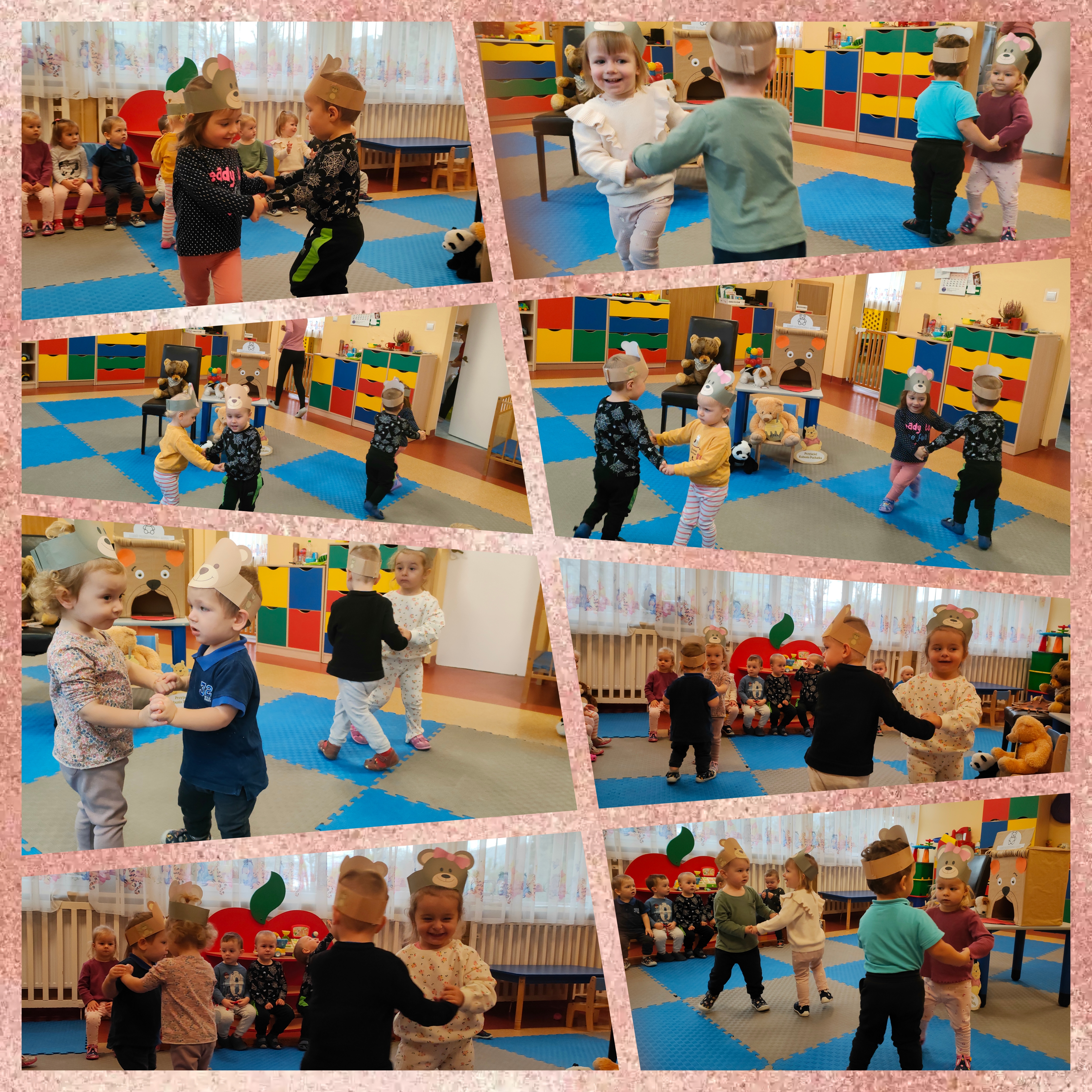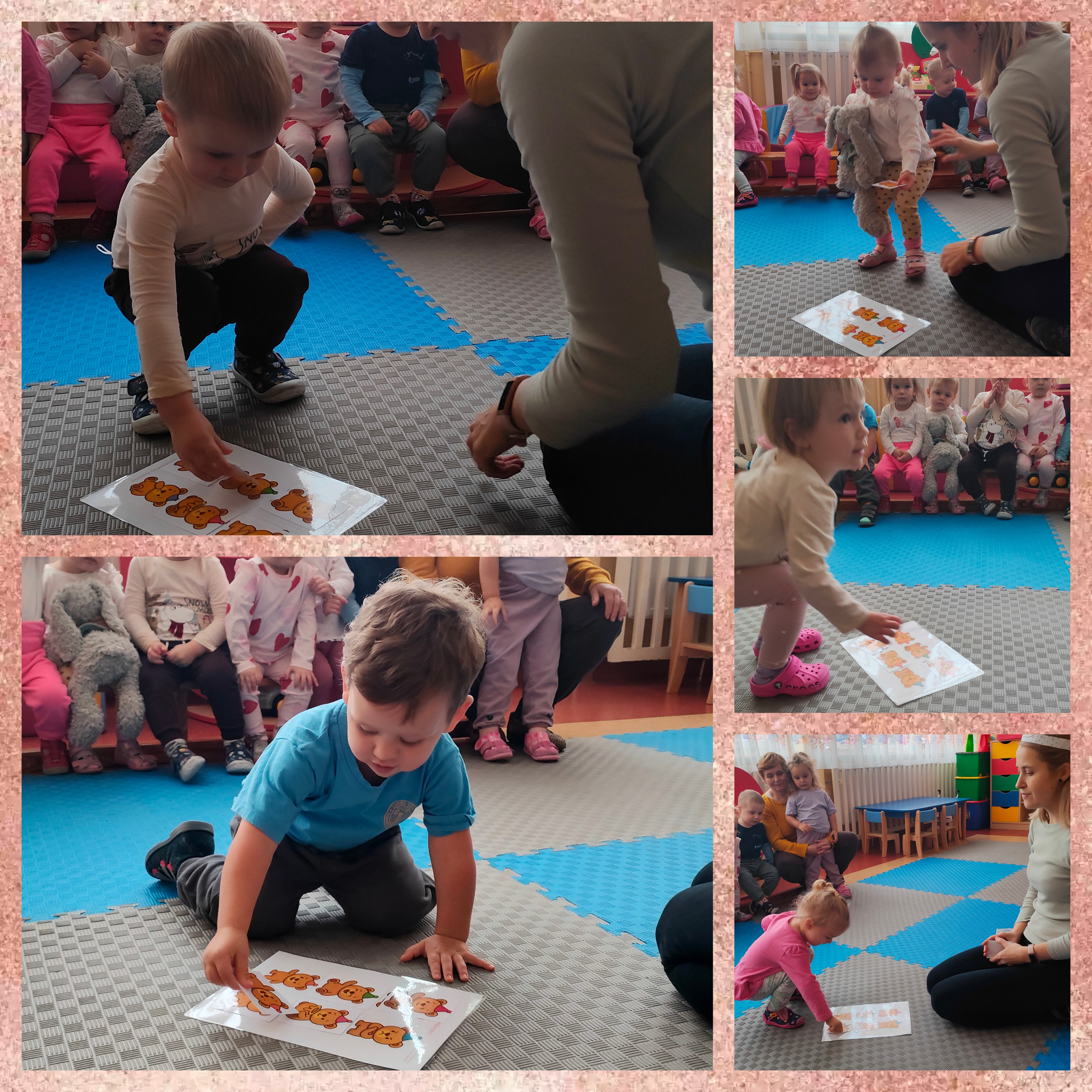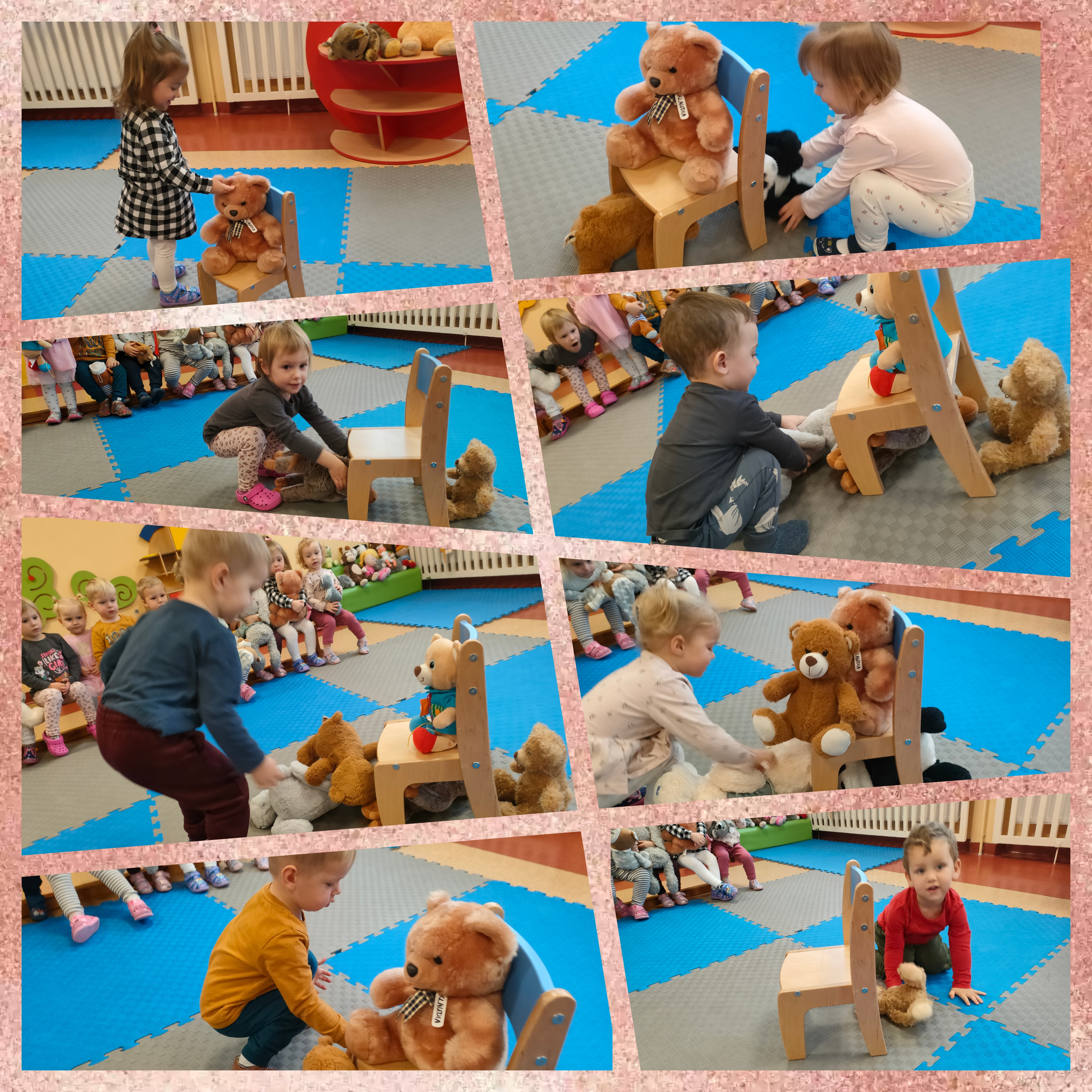 W naszej grupie Święto Pluszowego Misia obchodzone było szczególnie. Tego dnia każde dziecko przyszło do żłobka ze swoim milutkim przyjacielem, by wspólnie z innymi celebrować te pełne radości chwile. Na dzieci i misie czekało wiele atrakcji. Maluszki poznały krótką historię misia z wiersza "Naprawimy misia" C. Janczarskiego. Wiersz opiera się na motywie naprawiania i troski o uszkodzoną zabawkę. Dzieci uczą się, że nie trzeba wyrzucać zepsutych zabawek, ponieważ można je naprawić i cieszyć się nimi dalej. Można też wiersz odczytywać jako symbol dbania o relacje, przyjaźń i wsparcie w trudnych chwilach. Maluszki uczestniczyły także w zabawach ruchowych i zręcznościowych. Bawiły się chustą animacyjną. Turlały kulkami do paszczy misia. Przypinały spinacze do papierowej głowy misia, ćwicząc motorykę małą. Dzieci urządziły misiom przyjęcie urodzinowe. Uczyły się, w jaki sposób prawidłowo ułożyć naczynia i sztućce na stole. Każde dziecko miało okazję samo nakryć do stołu. Maluszki posadziły misie przy stole i je nakarmiły. Nie obyło się bez gromkiego "Sto lat" dla pluszowych solenizantów. Takie role uczą dzieci zasad społecznych, takich jak grzeczność i szacunek dla innych. Maluszki wykonały również przepiękne prace plastyczne z misiem w roli głównej. Dla pełnego rozwoju dziecka niezmiernie ważna jest orientacja przestrzenna, która towarzyszy mu codziennie w otaczającej rzeczywistości. Dlatego dzieci umieszczały misia według instrukcji opiekunki (na, pod, za, przed krzesłem). Dużo emocji dostarczyły dzieciom misiowe ćwiczenia buzi i języka, ćwiczenia oddechowe – dmuchanie przez usta i degustacja chrupek oblanych miodem. Mamy nadzieję, że misiowy tydzień na długo pozostanie we wspomnieniach dzieci. Ponad to dzieci uczestniczyły w zajęciach profilaktycznych - Zdrowe ząbki. Z panią pielęgniarką myły ząbki. Jak w każdy wtorek gościmy panią od angielskiego, która uczy nasze maluszki nowych słówek.