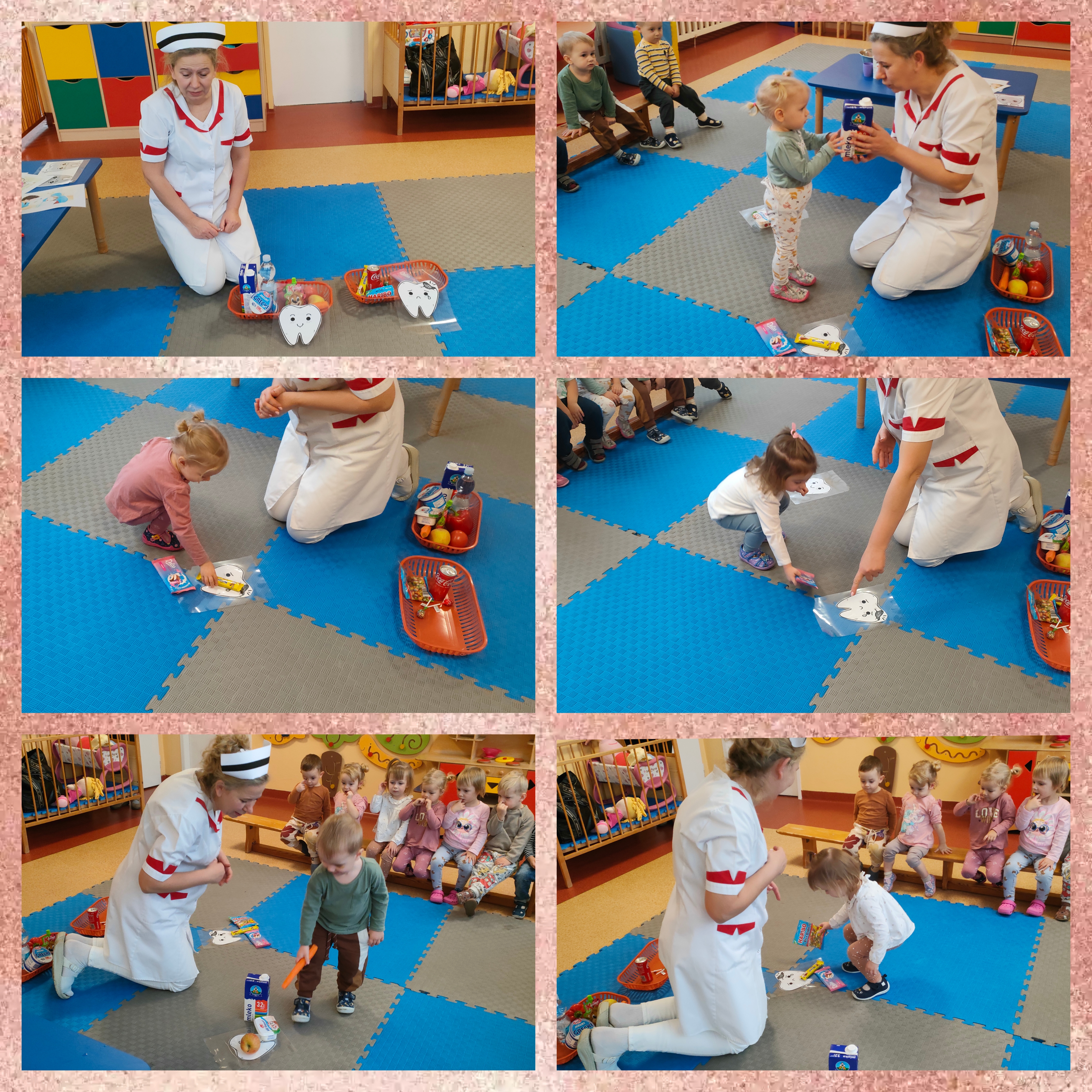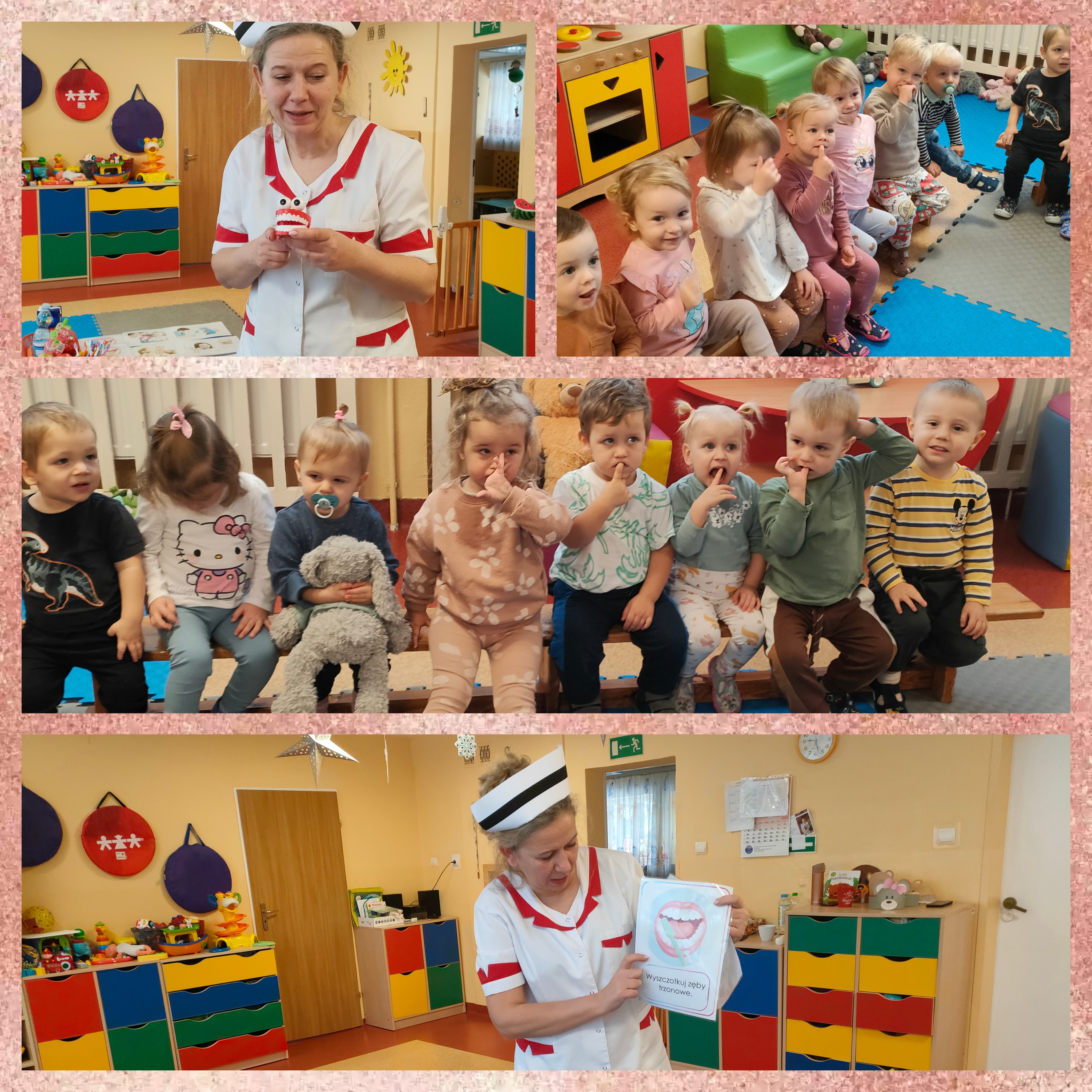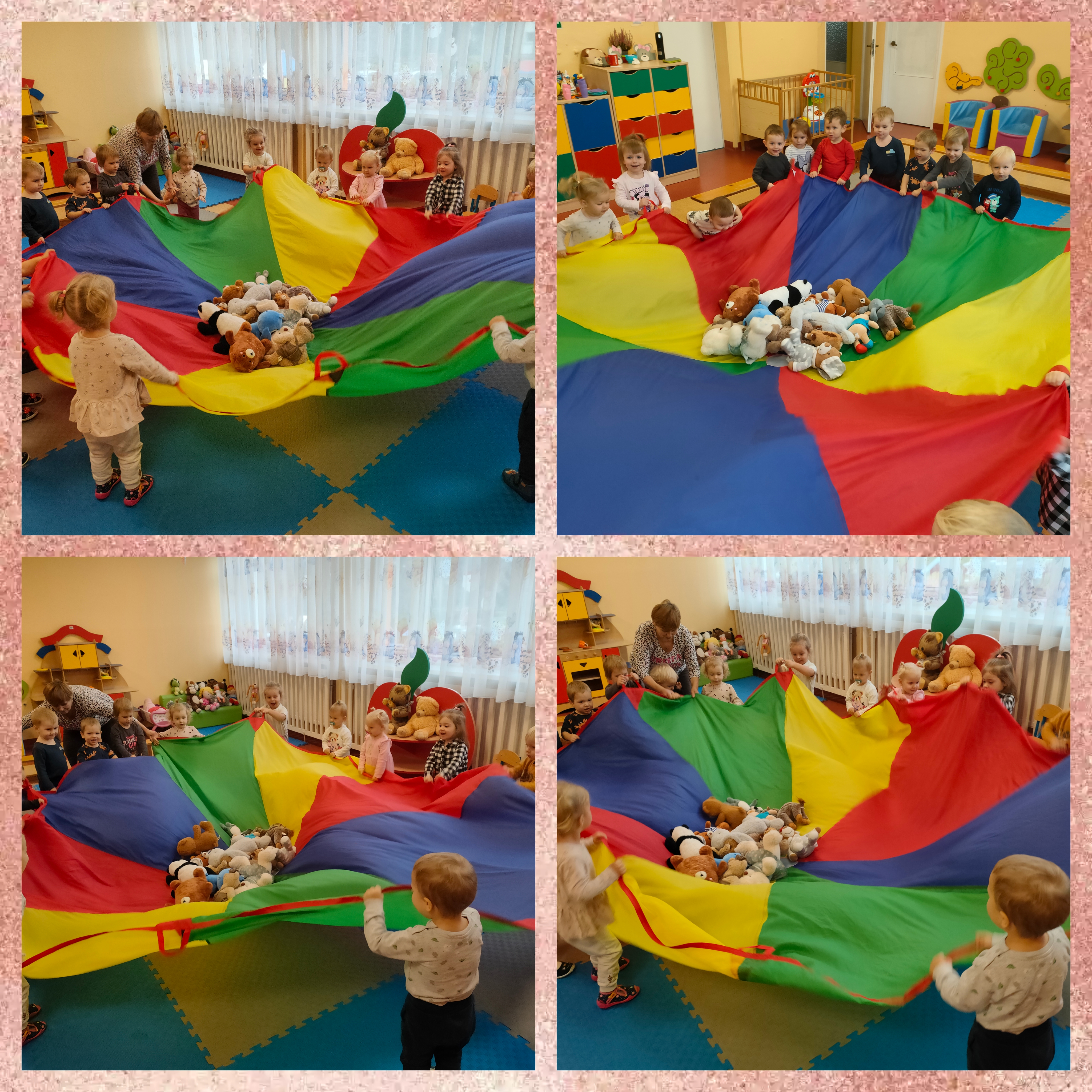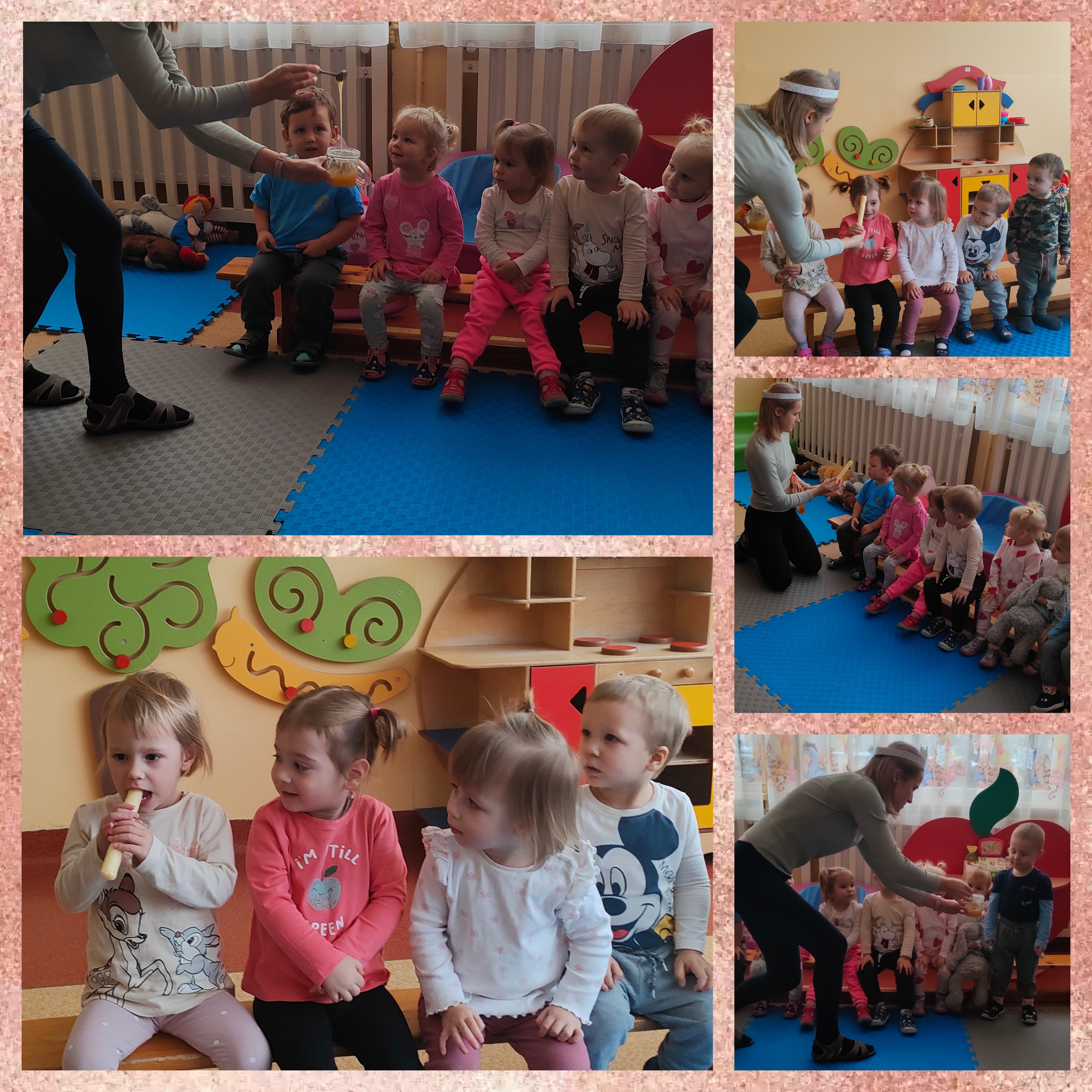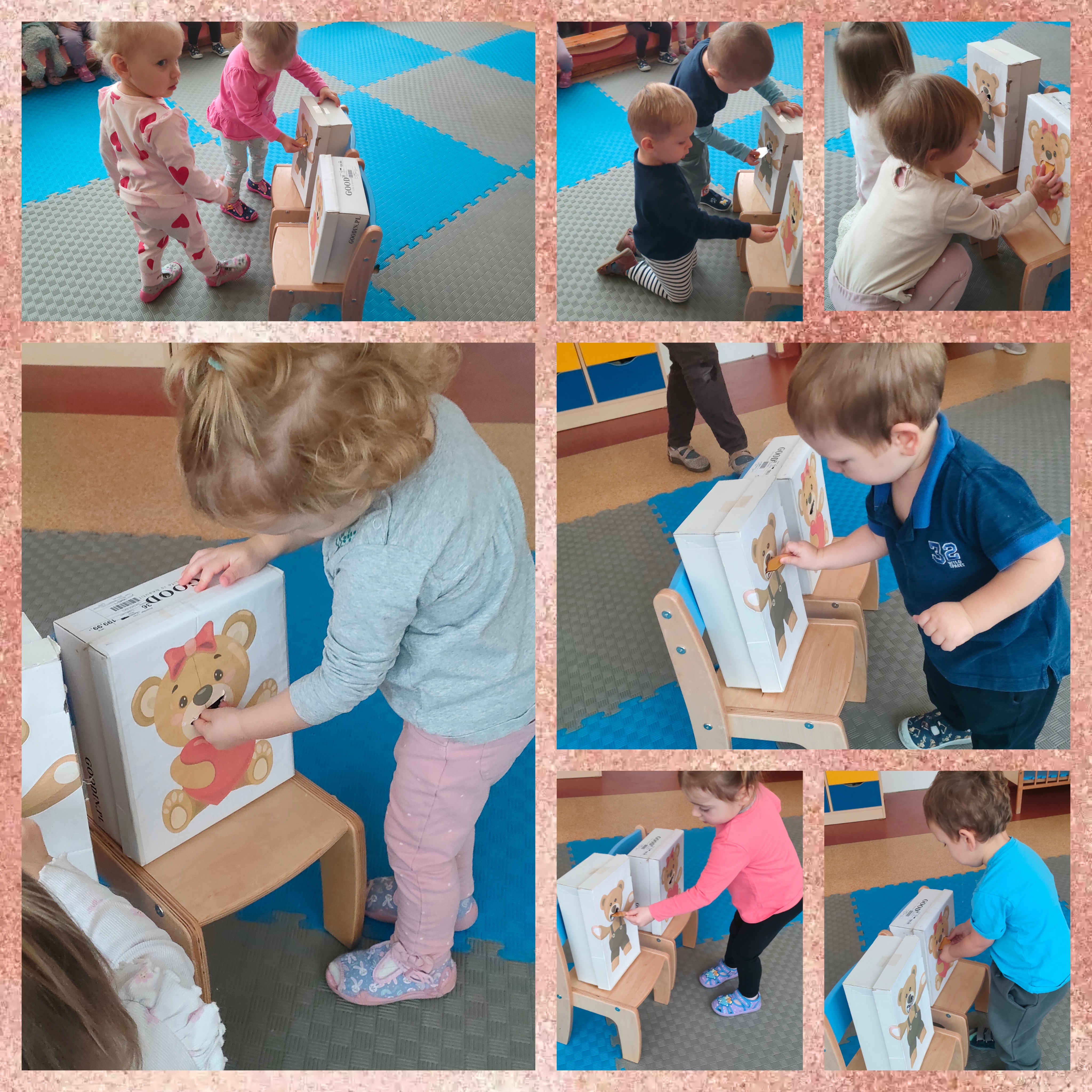 W naszej grupie Święto Pluszowego Misia obchodzone było szczególnie. Tego dnia każde dziecko przyszło do żłobka ze swoim milutkim przyjacielem, by wspólnie z innymi celebrować te pełne radości chwile. Na dzieci i misie czekało wiele atrakcji. Maluszki poznały krótką historię misia z wiersza "Naprawimy misia" C. Janczarskiego. Wiersz opiera się na motywie naprawiania i troski o uszkodzoną zabawkę. Dzieci uczą się, że nie trzeba wyrzucać zepsutych zabawek, ponieważ można je naprawić i cieszyć się nimi dalej. Można też wiersz odczytywać jako symbol dbania o relacje, przyjaźń i wsparcie w trudnych chwilach. Maluszki uczestniczyły także w zabawach ruchowych i zręcznościowych. Bawiły się chustą animacyjną. Turlały kulkami do paszczy misia. Przypinały spinacze do papierowej głowy misia, ćwicząc motorykę małą. Dzieci urządziły misiom przyjęcie urodzinowe. Uczyły się, w jaki sposób prawidłowo ułożyć naczynia i sztućce na stole. Każde dziecko miało okazję samo nakryć do stołu. Maluszki posadziły misie przy stole i je nakarmiły. Nie obyło się bez gromkiego "Sto lat" dla pluszowych solenizantów. Takie role uczą dzieci zasad społecznych, takich jak grzeczność i szacunek dla innych. Maluszki wykonały również przepiękne prace plastyczne z misiem w roli głównej. Dla pełnego rozwoju dziecka niezmiernie ważna jest orientacja przestrzenna, która towarzyszy mu codziennie w otaczającej rzeczywistości. Dlatego dzieci umieszczały misia według instrukcji opiekunki (na, pod, za, przed krzesłem). Dużo emocji dostarczyły dzieciom misiowe ćwiczenia buzi i języka, ćwiczenia oddechowe – dmuchanie przez usta i degustacja chrupek oblanych miodem. Mamy nadzieję, że misiowy tydzień na długo pozostanie we wspomnieniach dzieci. Ponad to dzieci uczestniczyły w zajęciach profilaktycznych - Zdrowe ząbki. Z panią pielęgniarką myły ząbki. Jak w każdy wtorek gościmy panią od angielskiego, która uczy nasze maluszki nowych słówek.