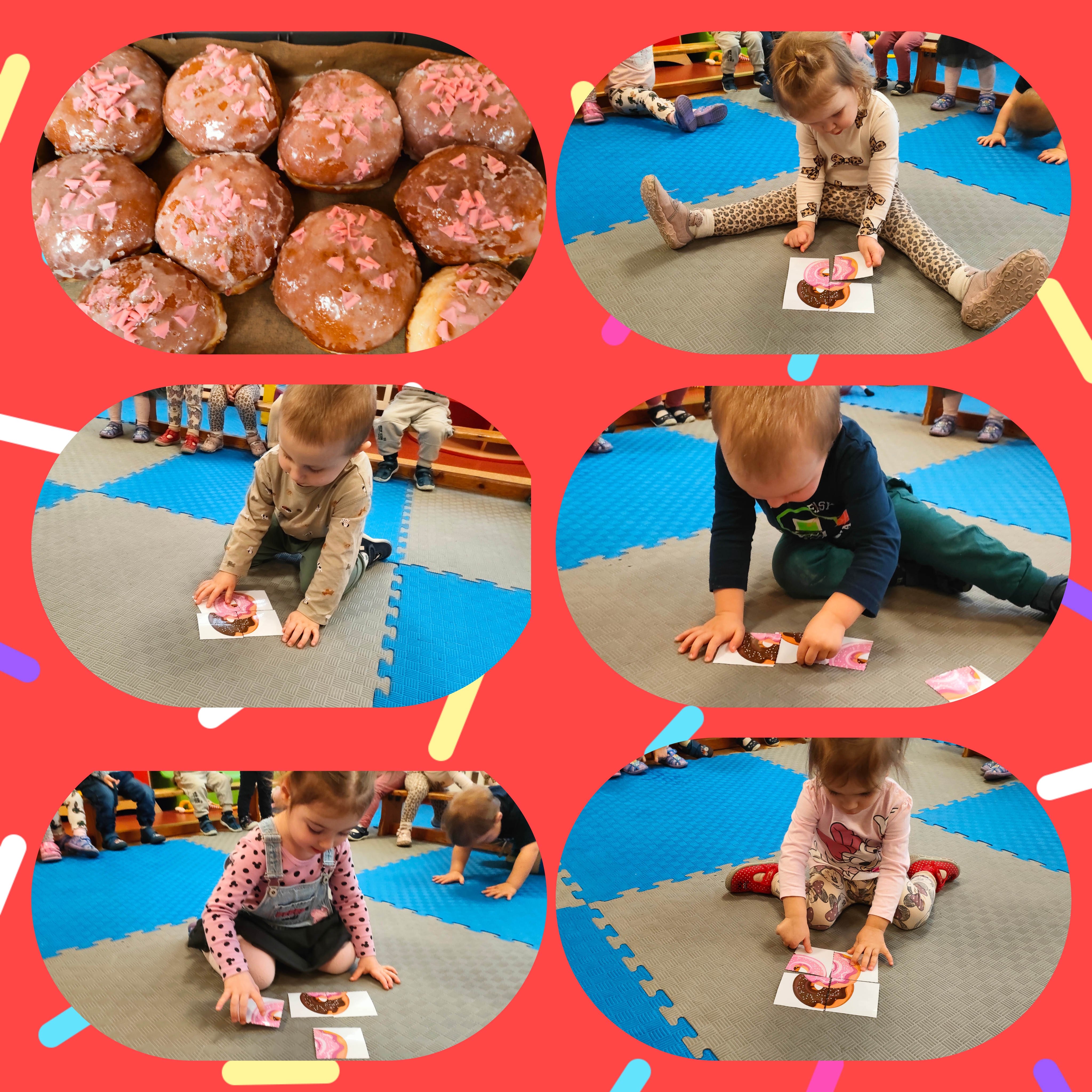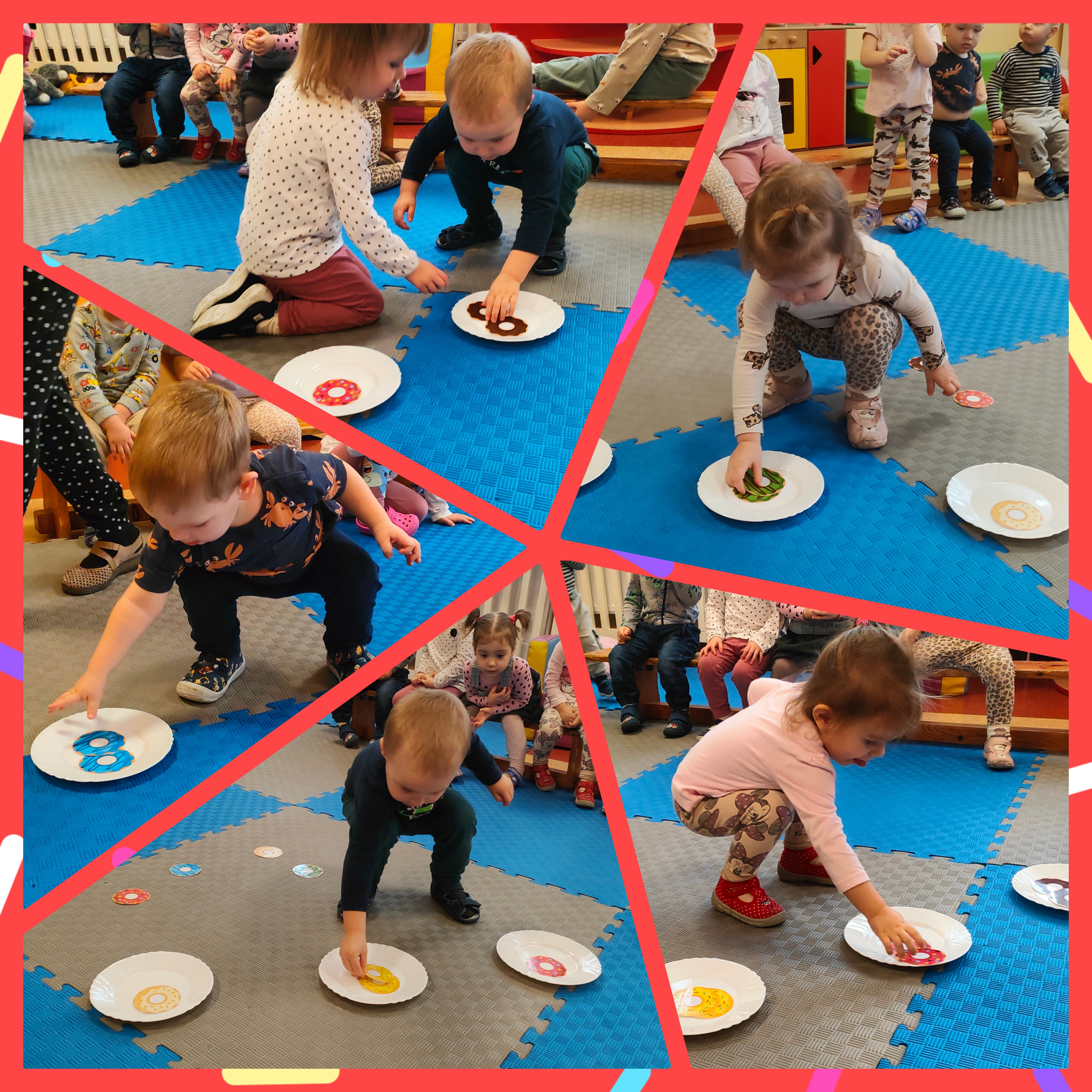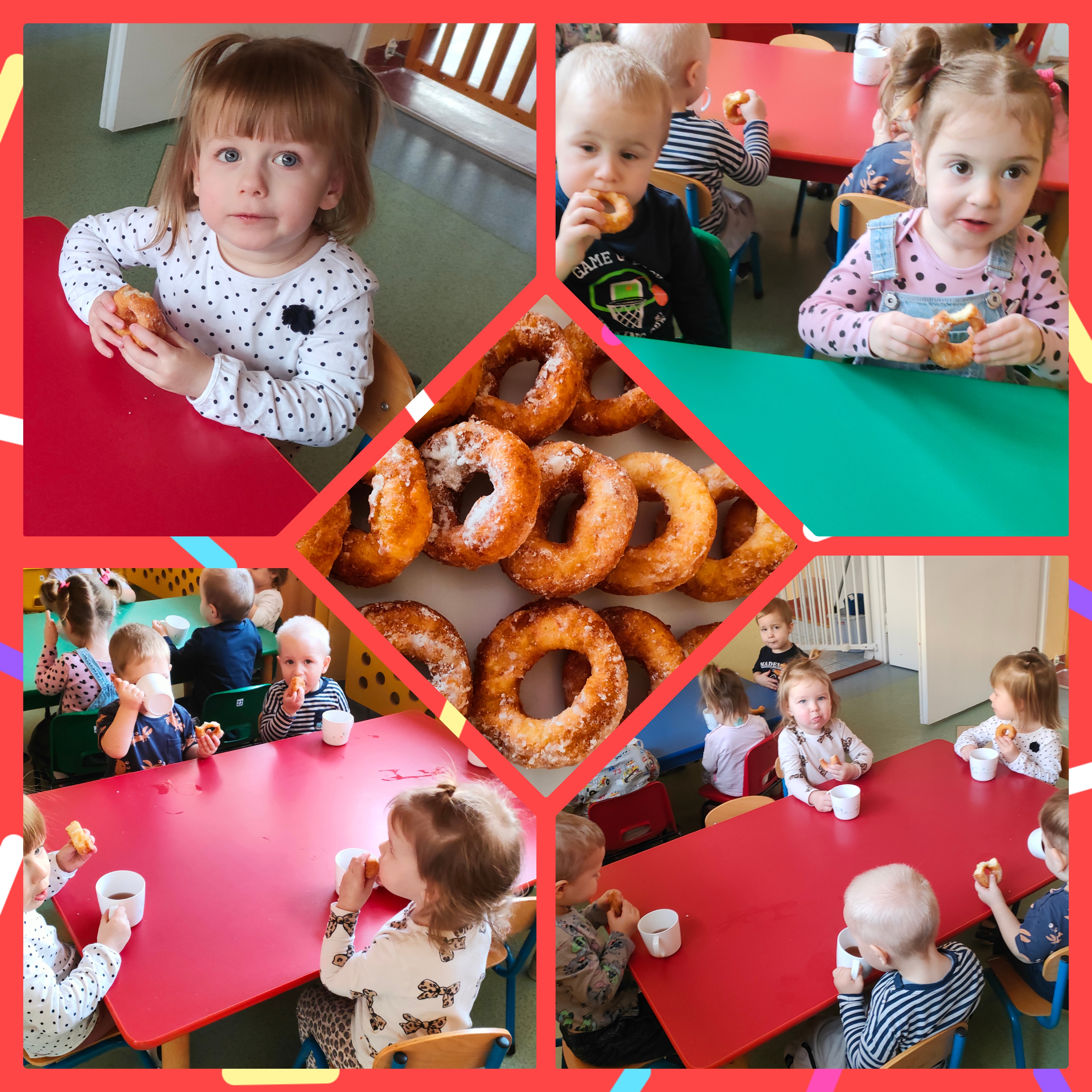 Tłusty Czwartek był wyjątkowy. Od rana unosił się zapach w naszym żłobku, ponieważ panie z kuchni nie zapomniały, że to Tłusty Czwartek i przygotowały dla każdej grupy tacę małych oponków. Kolejka po dokładki była bardzo długa. Przygotowaliśmy różne zabawy pączkowe. Dzieci segregowały je według kolorów. Układały na talerzu. Była też pączkowa zabawa: "Z rączek do rączek spaceruje pączek, na kogo trafi ten go zje. Ile było gryzów policz je."