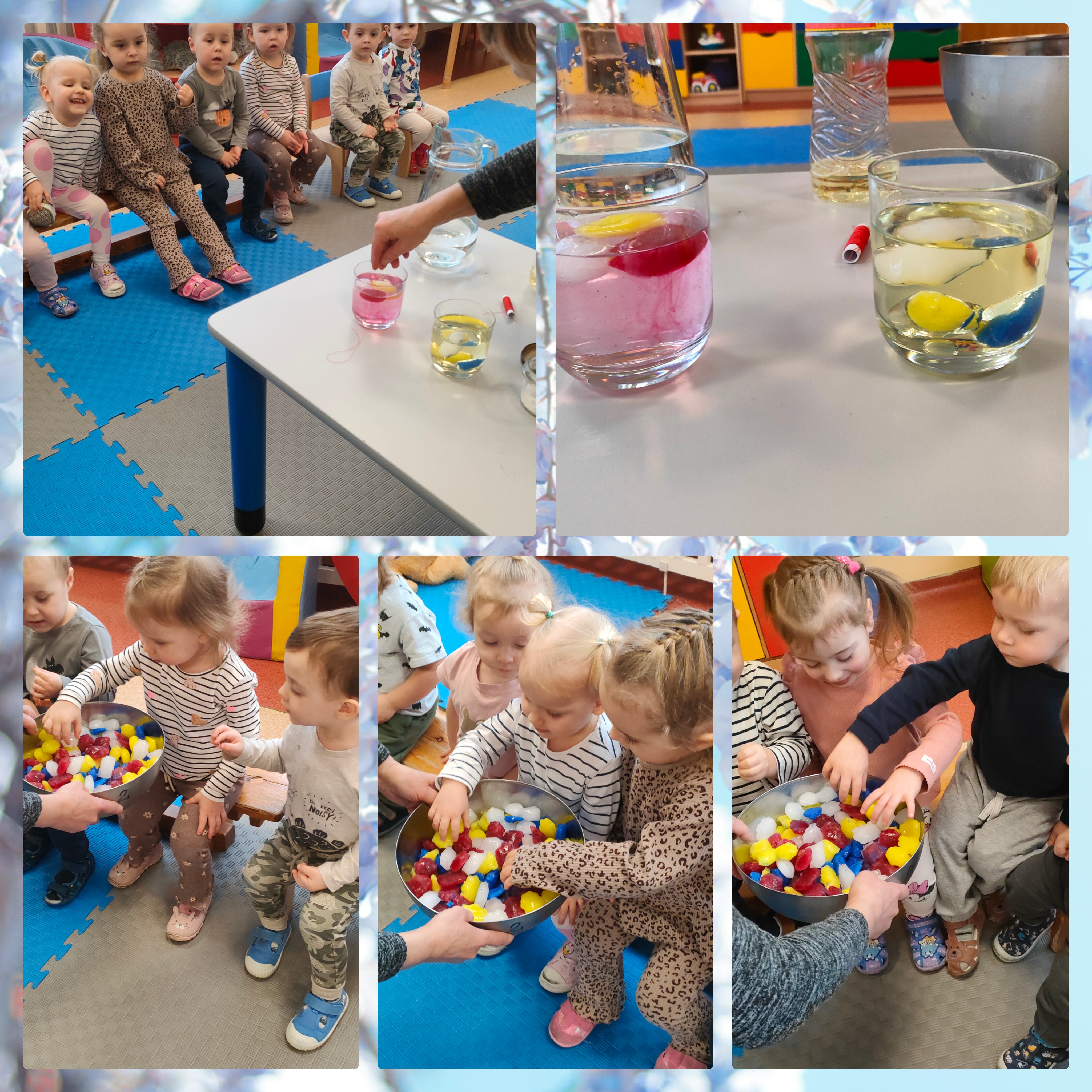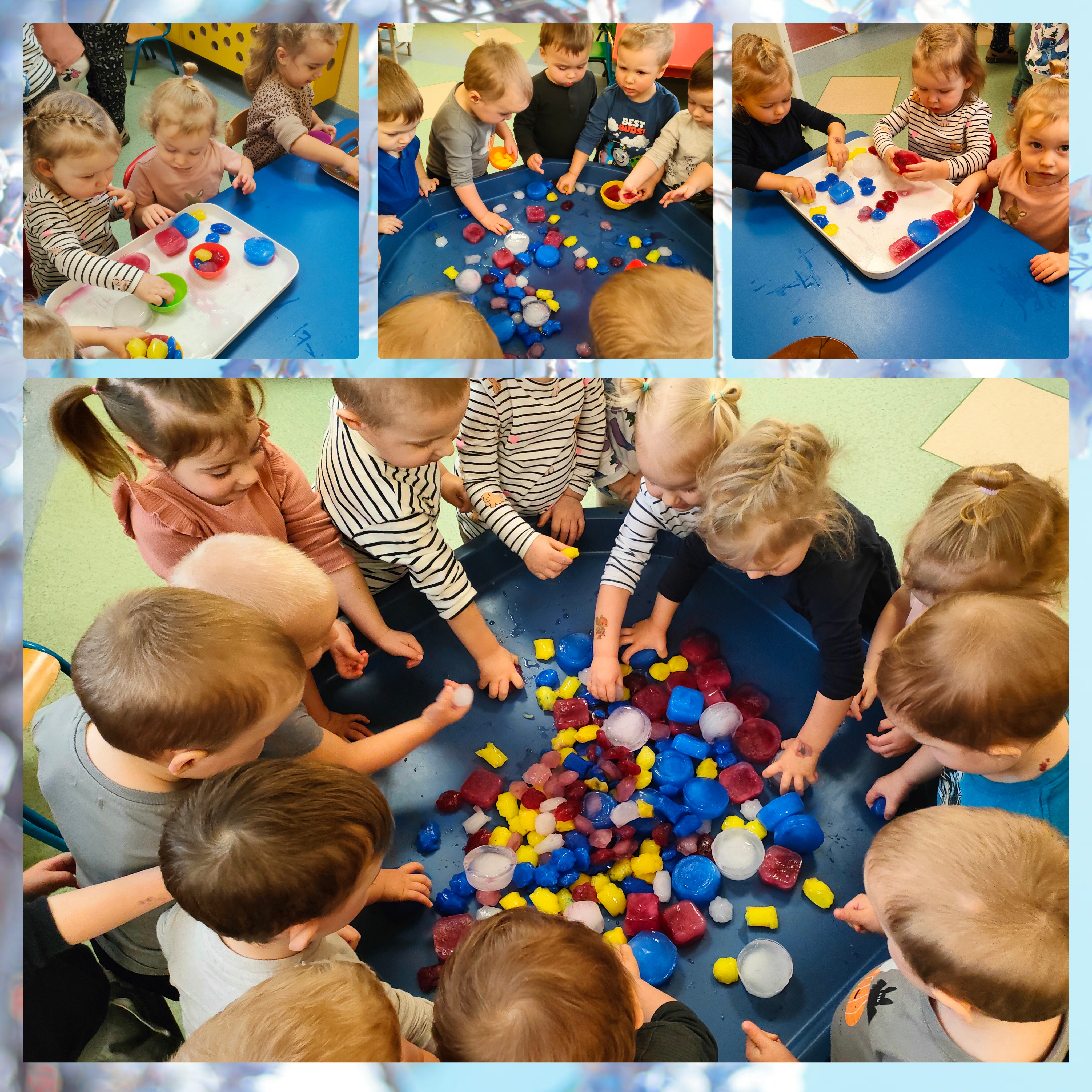 Na zajęciach z wykorzystaniem kostek lodu badaliśmy jego cechy. Dzieci obserwowały lód w trakcie pływania w wodzie i oleju, sprawdzały tempo jego topnienia w ciepłej i zimnej wodzie oraz pod wpływem soli. Ćwiczyły sprawność rąk oraz koncentrację przy swobodnej zabawie z kostkami lodu.