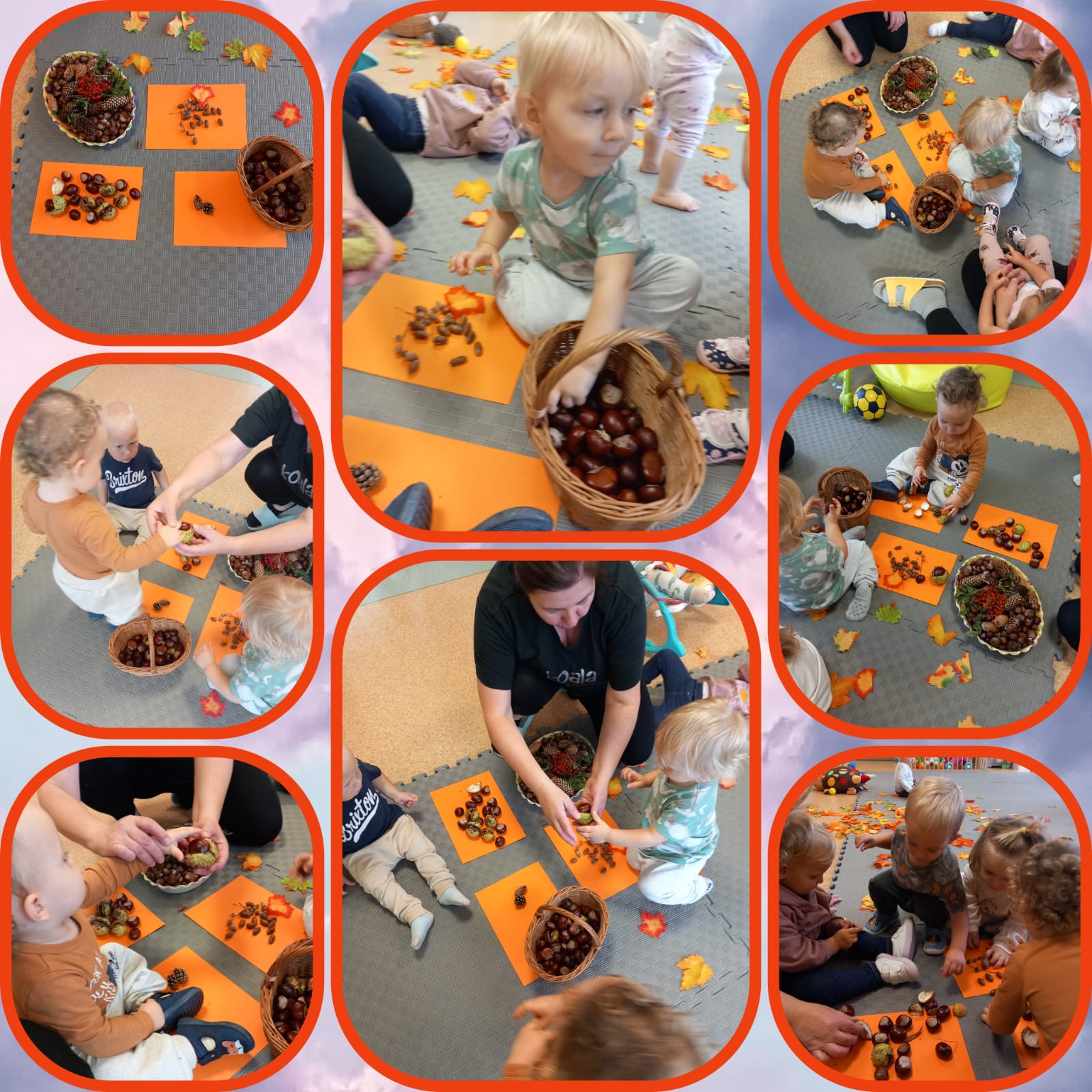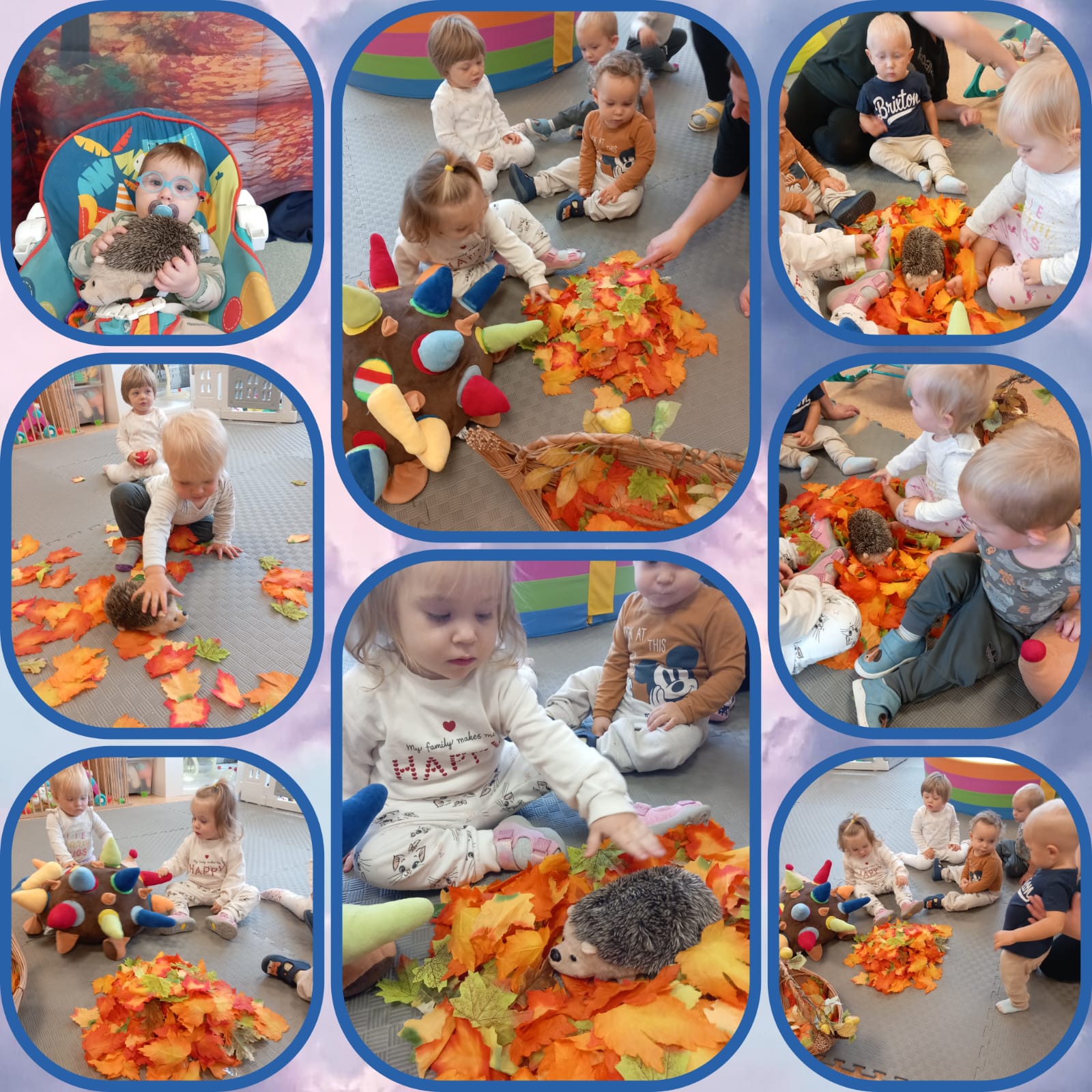 Maluszki poznały jeża. Wyszukiwały go w liściach, osłuchiwały się z nową piosenką "A w ogrodzie jeżyk śpi". Oglądały dary jesieni, dotykały kasztanów, żołędzi i szyszek.