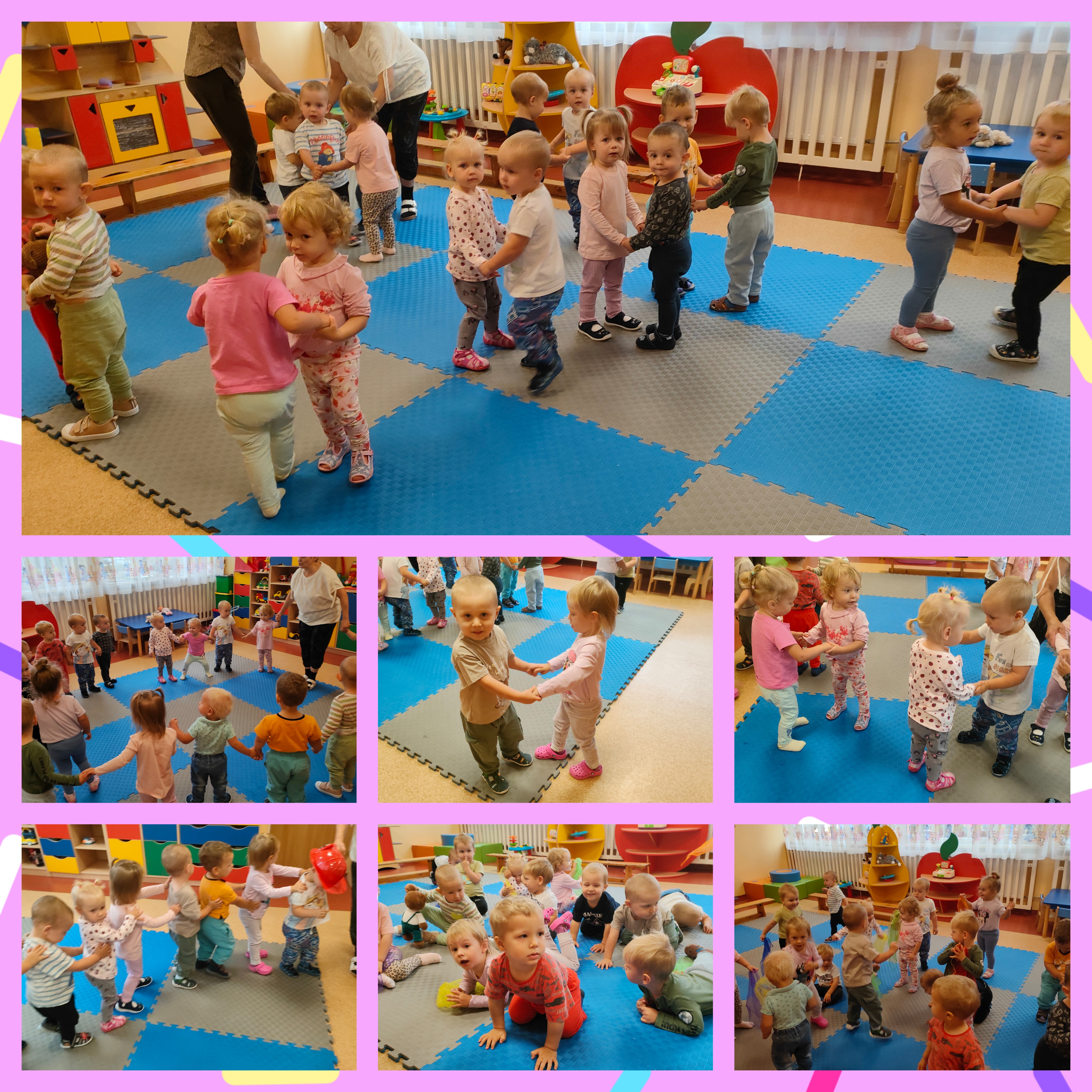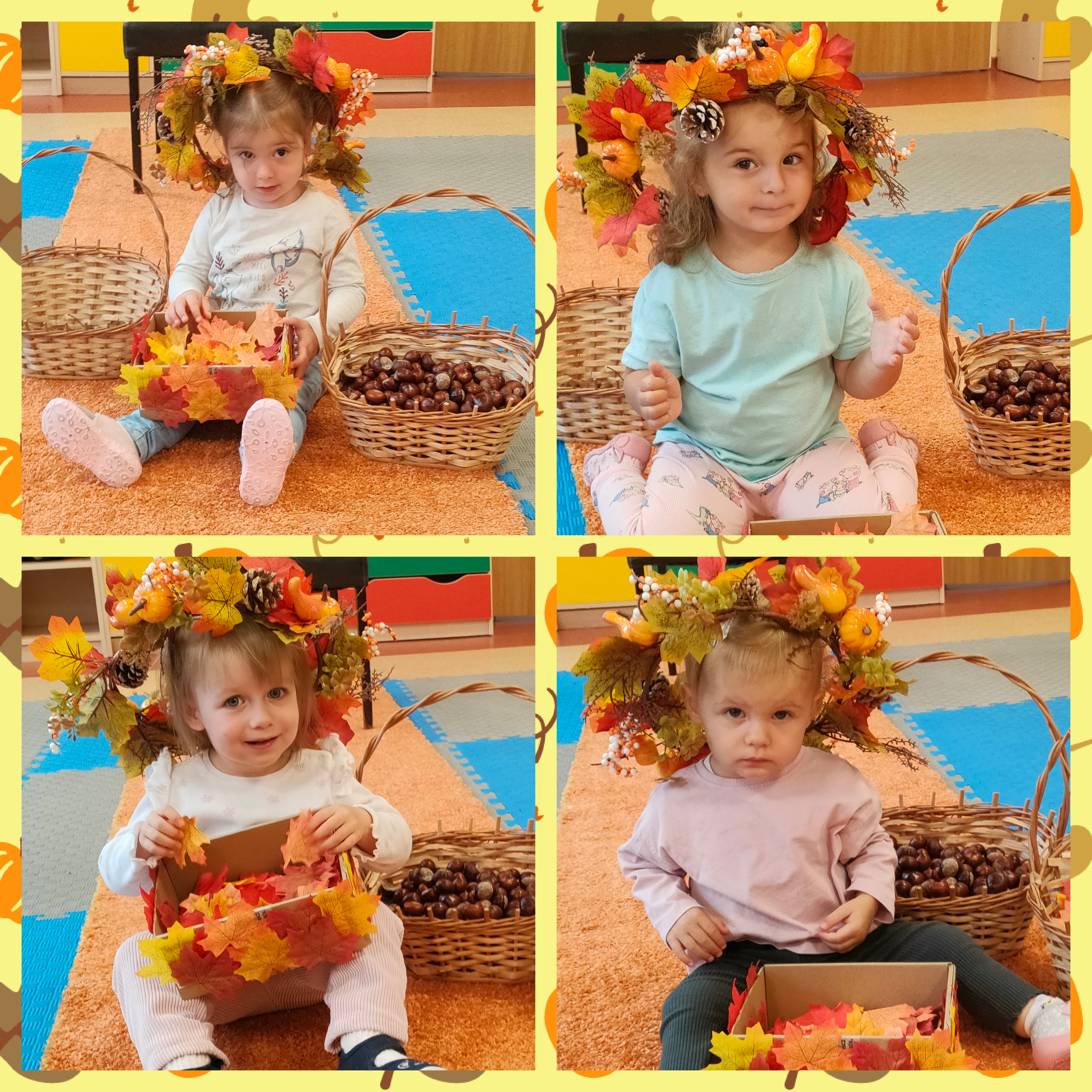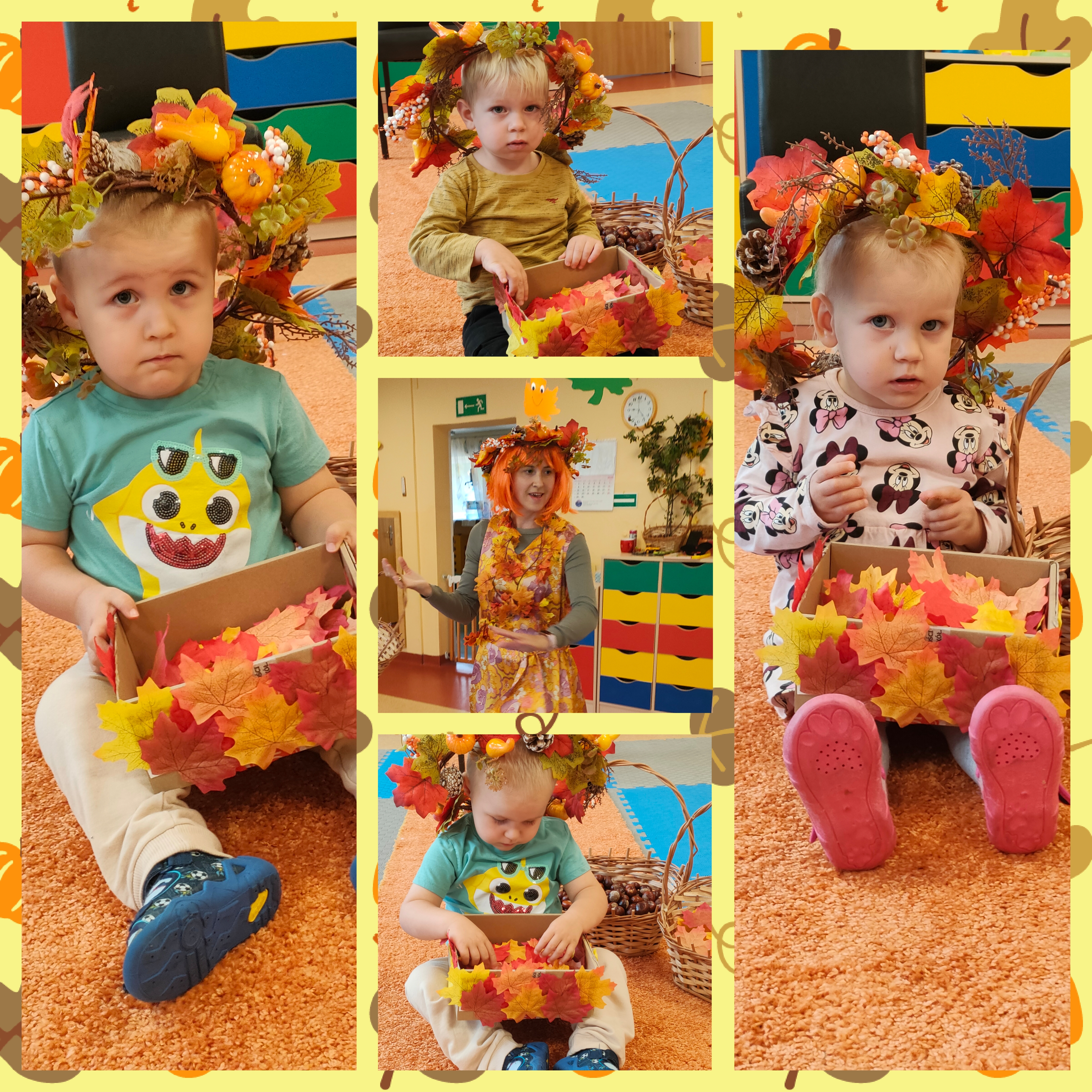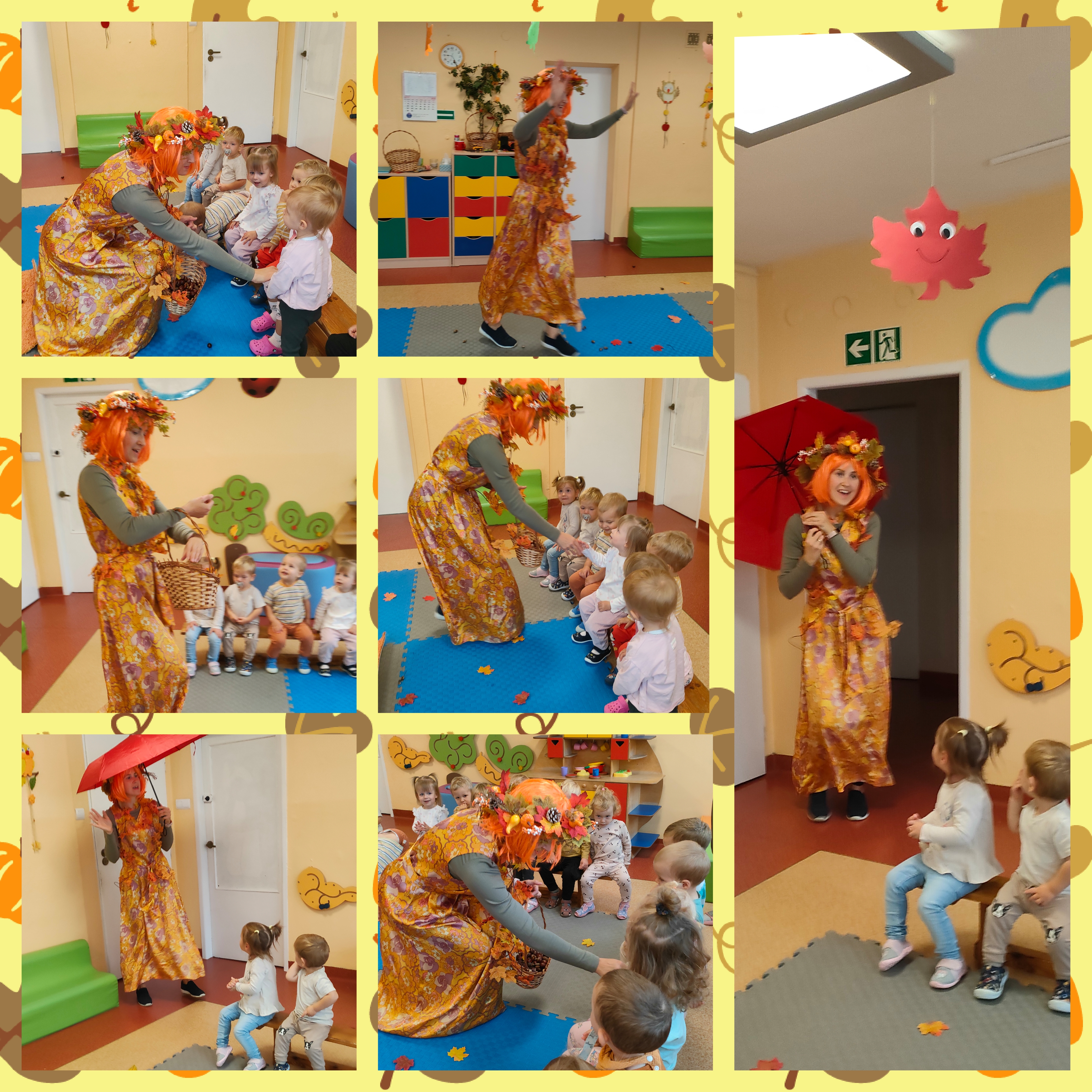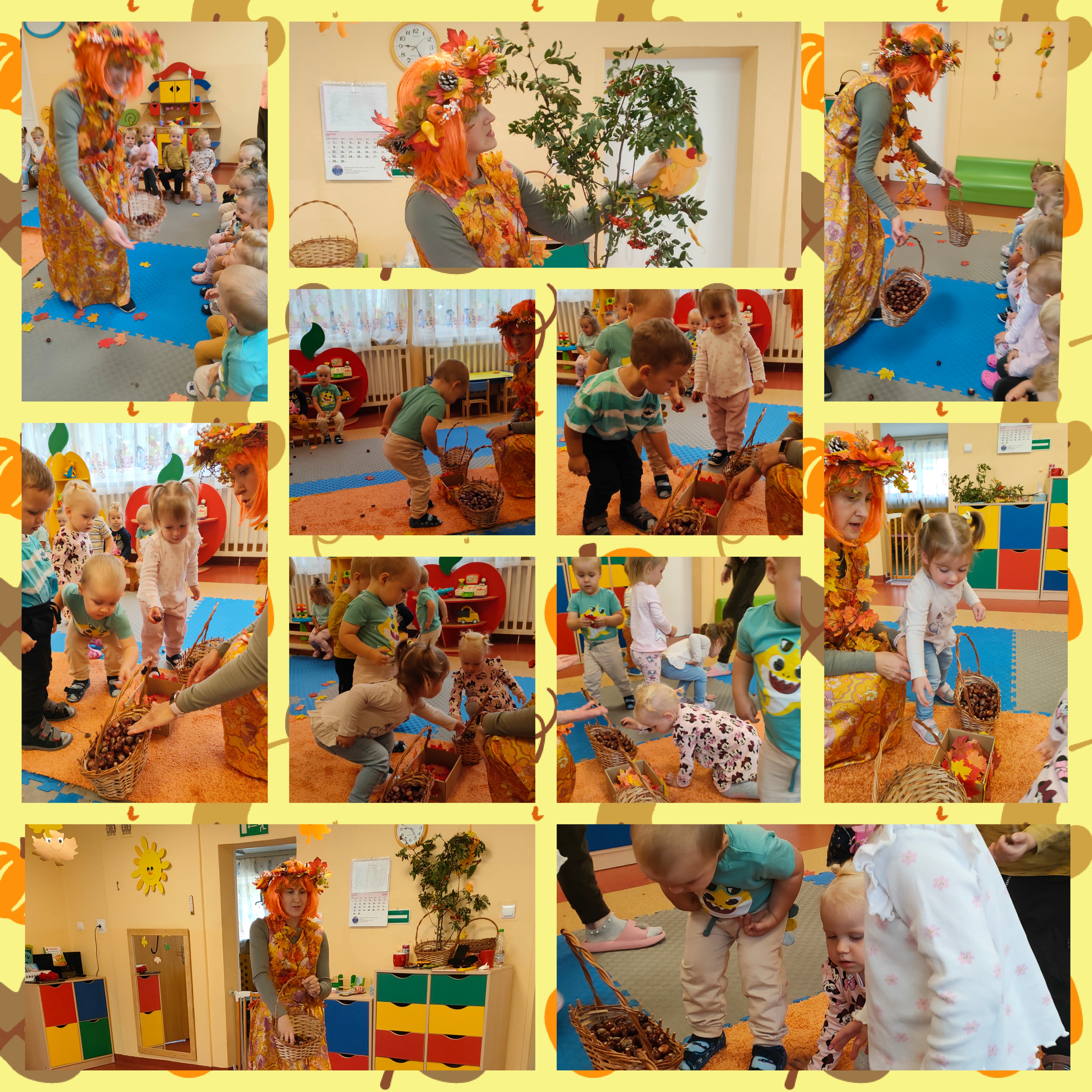 Bawiliśmy się z Kropką w dniu jej święta (15 września). Witaliśmy panią jesień, podziwiając różnorodność jej darów. Segregowaliśmy je na kategorie: kasztany, żołędzie, liście. Na spacerze przyglądaliśmy się, jak wygląda przyroda jesienią. A gdy nie było pogody bawiliśmy się w sali zabaw (tworzyliśmy różne rzeczy z klocków, np. instrumenty; układaliśmy puzzle, układanki; oglądaliśmy książeczki; bawiliśmy się autami, lalkami). Tańczyliśmy - realizując program taneczny, dzięki któremu dzieci uczą się kształtowania koordynacji, poczucia rytmu i sprawności fizycznej.